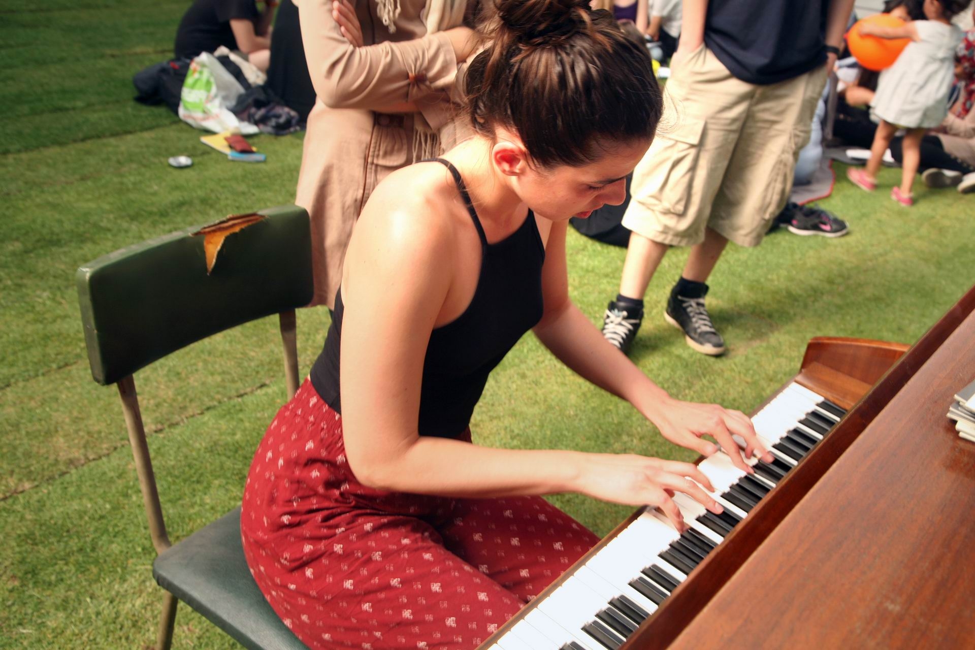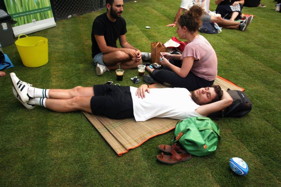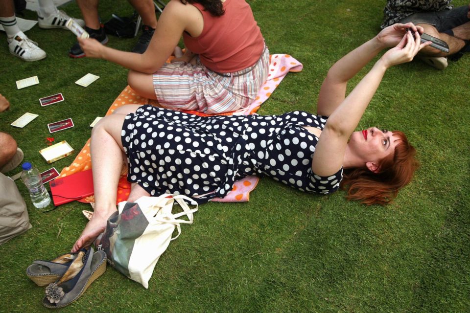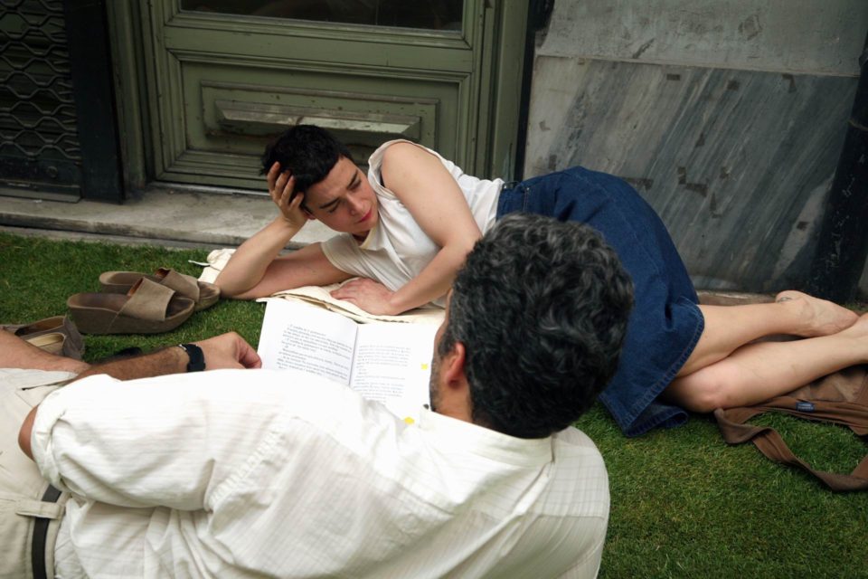 Για την ώρα πολλοί τρώνε, άλλοι κοιμούνται, δύο κοπέλες έχουν βγάλει λαπτοπ και δουλεύουν, άλλοι χαζεύουν τα κινητά τους και πιάνουν κουβέντα με αφορμή τον Κίτσο. Μια κυρία που θέλει να διασχίσει τη στοά, βγάζει τα παπούτσια, πατάει πάνω στο γρασίδι, τα ξαναφορά μόλις αυτό τελειώνει. Κάπου στο βάθος ακούγονται κόρνες αυτοκινήτων, εδώ μέσα ακούγεται Χατζιδάκις.