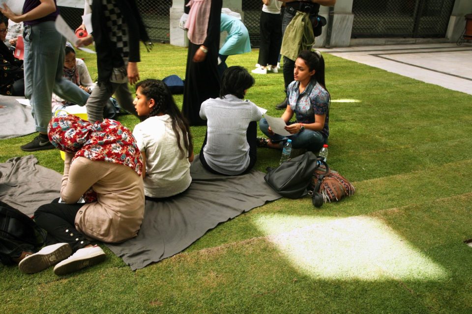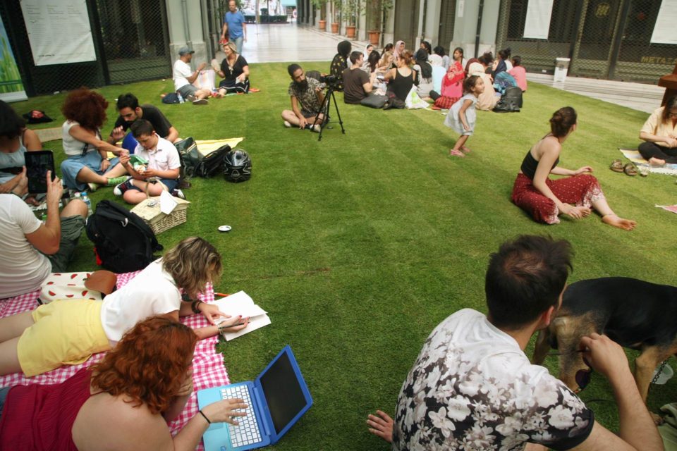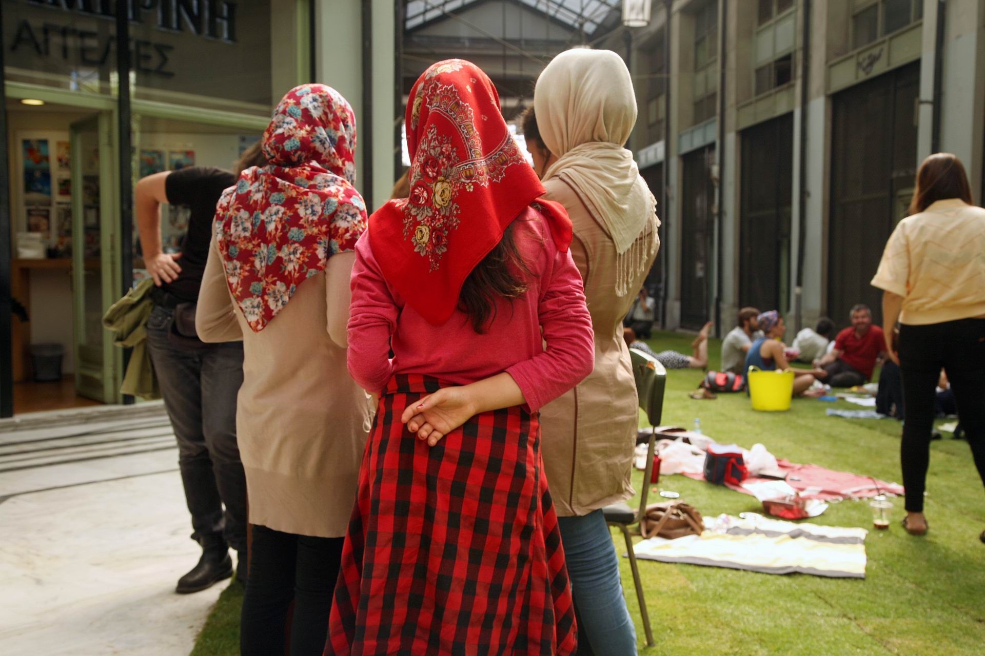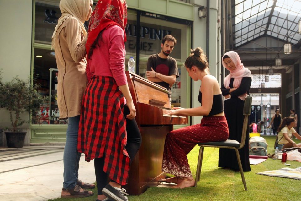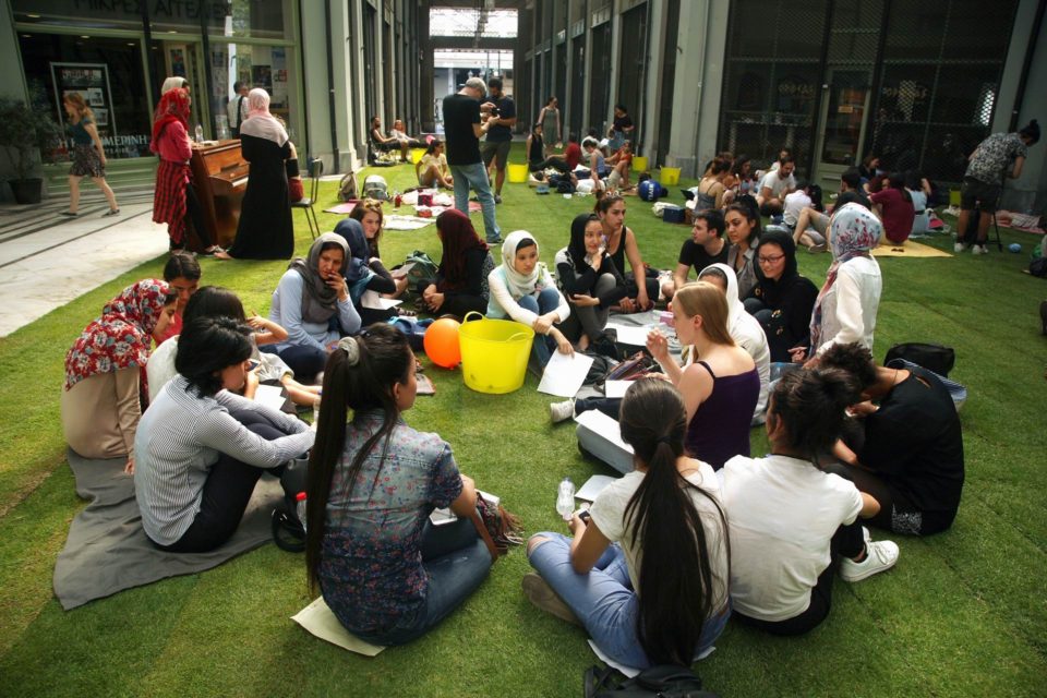 Κατά τις 15:30 η στοά, που κατασκευάστηκες στις αρχές του 20ου αιώνα, άρχισε να γεμίζει με κόσμο. Κουβέρτες στρώθηκαν, βγήκαν τα καλαθάκια με το φαγητό, μπάλες φούσκωσαν, επιτραπέζια κάρτες έπεσαν στο γρασίδι και κάποιοι απλώς ξάπλωσαν και έκλεισαν τα μάτια. Ανάμεσα μας κορίτσια και νέες γυναίκες πρόσφυγες από τη Συρία και το Αφγανιστάν που τραβούν τα βλέμματα με τα πολύχρωμα μαντίλια τους. Είναι γυναίκες που συμμετέχουν στο κοινωνικό δίκτυο «Μέλισσα» που επιχειρεί να συγκεντρώσει την κοινωνική δράση των μεταναστριών και των οργανώσεών τους, με σκοπό την αντιμετώπιση των σύγχρονων προβλημάτων τους και τη διαμόρφωση ενός κοινωνικού πλαισίου, στο οποίο θα μπορέσουν να χτίσουν μία καλύτερη ζωή για τις ίδιες και την οικογένειά τους.