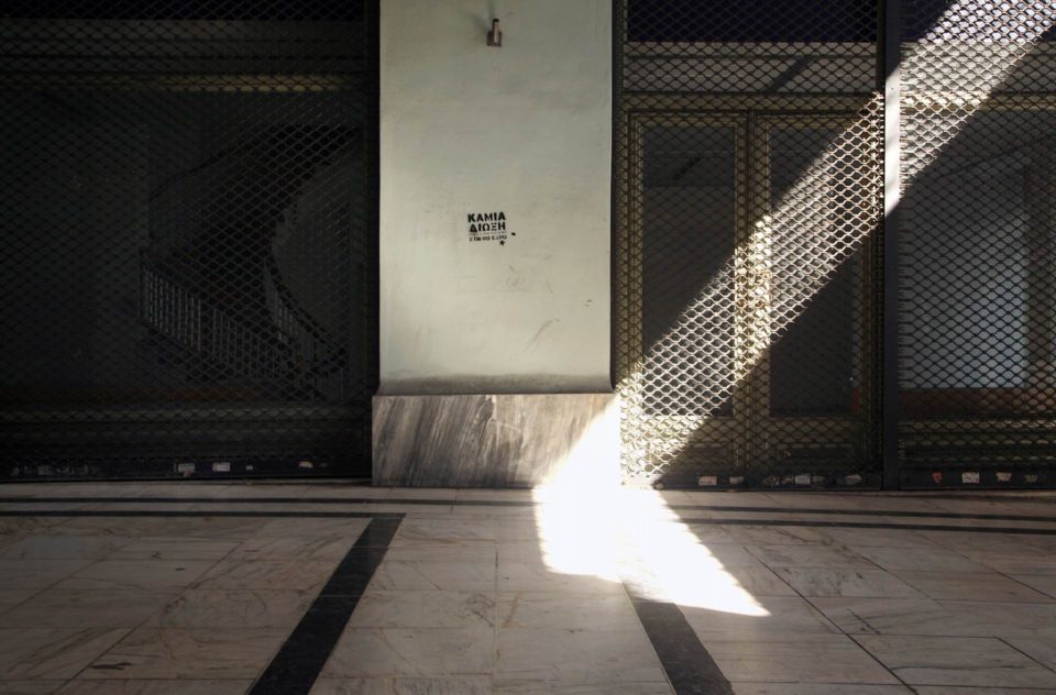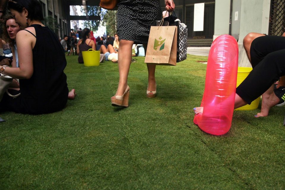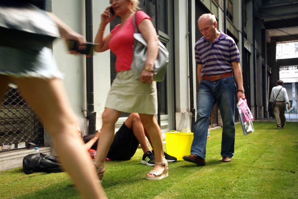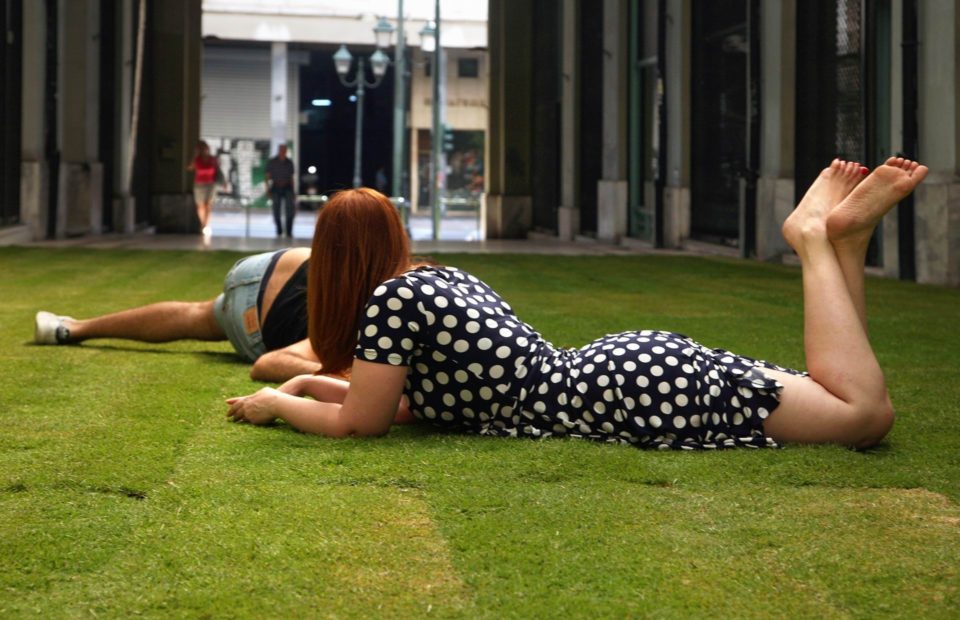 Μια κυρία που διέρχεται τη στοά με κατεύθυνση τη Σταδίου, σταματάει όταν φτάνει μπροστά στο γρασίδι. Δείχνει προβληματισμένη, σαν μην ξέρει εάν πρέπει να πατήσει με τα παπούτσια πάνω, πάει να κάνει τον κύκλο αλλά συνειδητοποιεί ότι δεν υπάρχει επιλογή κι έτσι κάνει το γενναίο βήμα και απλώς περνάει. Ο Κωνσταντίνος μου λέει ότι πολλοί έχουν παρόμοιο δισταγμό από το πρωί, φαίνεται ότι η απαγόρευση «Μην πατάτε το γκαζόν» έχει περάσει για τα καλά μέσα μας ενώ επιπλέον δεν ξέρουμε πώς να διαχειριστούμε το απροσδόκητο.