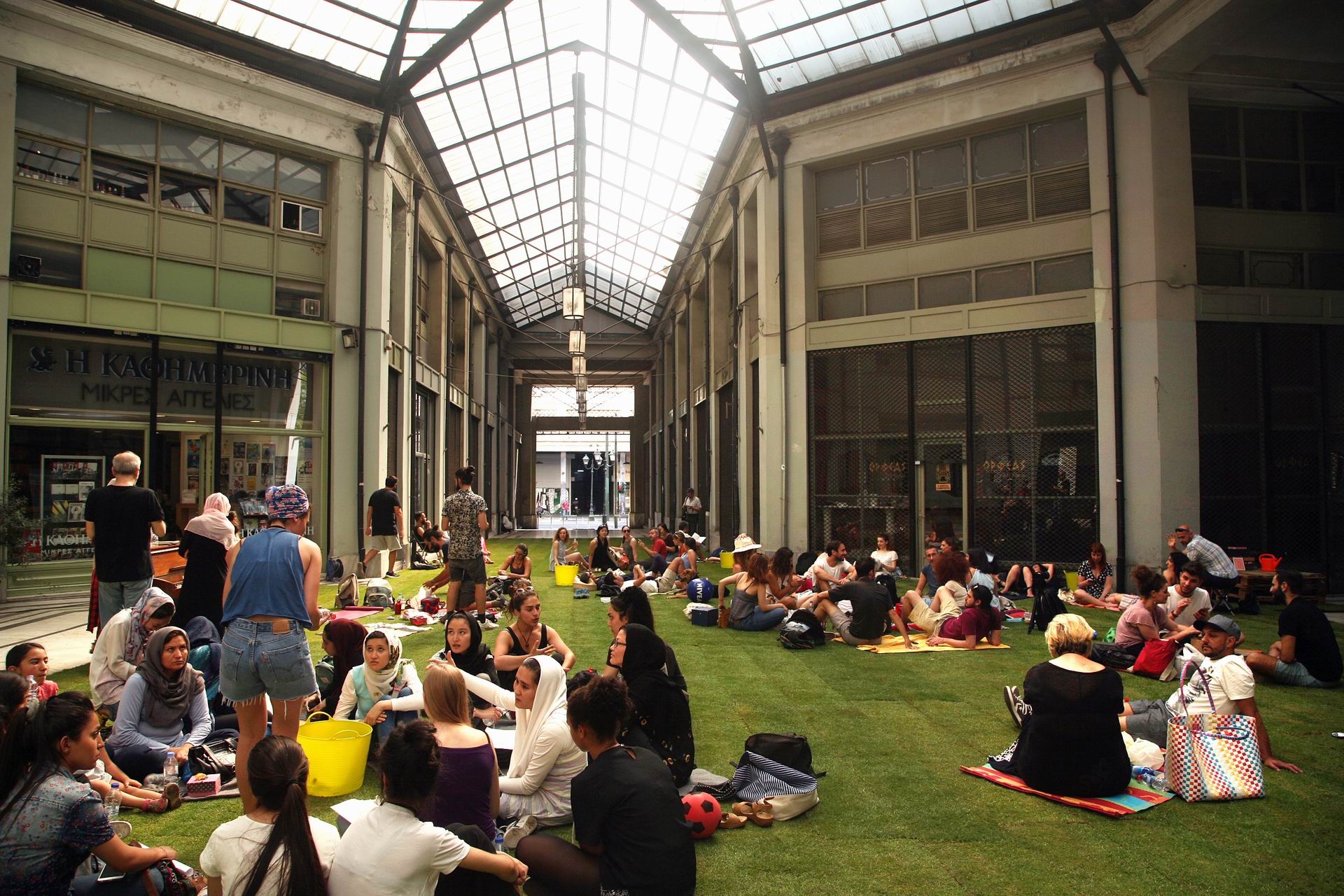 Κατά τις 15:30 η στοά, που κατασκευάστηκες στις αρχές του 20ου αιώνα, άρχισε να γεμίζει με κόσμο. Κουβέρτες στρώθηκαν, βγήκαν τα καλαθάκια με το φαγητό, μπάλες φούσκωσαν, επιτραπέζια κάρτες έπεσαν στο γρασίδι και κάποιοι απλώς ξάπλωσαν και έκλεισαν τα μάτια. Ανάμεσα μας κορίτσια και νέες γυναίκες πρόσφυγες από τη Συρία και το Αφγανιστάν που τραβούν τα βλέμματα με τα πολύχρωμα μαντίλια τους. Είναι γυναίκες που συμμετέχουν στο κοινωνικό δίκτυο «Μέλισσα» που επιχειρεί να συγκεντρώσει την κοινωνική δράση των μεταναστριών και των οργανώσεών τους, με σκοπό την αντιμετώπιση των σύγχρονων προβλημάτων τους και τη διαμόρφωση ενός κοινωνικού πλαισίου, στο οποίο θα μπορέσουν να χτίσουν μία καλύτερη ζωή για τις ίδιες και την οικογένειά τους.