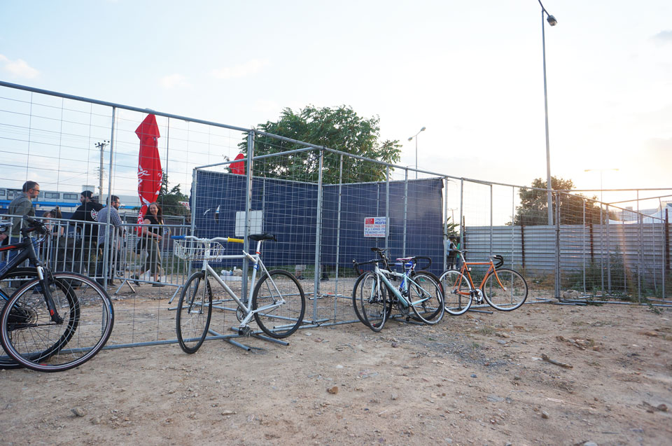 Φτάνοντας στο φεστιβάλ, αμέσως έψαξα χώρο για να κλειδώσω το ποδήλατο. Μπροστά στην είσοδο βρίσκονταν 2 περίπτερα ποδηλατικού ενδιαφέροντος, αν μη τι άλλο δείχνοντας την πρόθεση του φεστιβάλ να αγκαλιάσει την παγκόσμια αστική ποδηλατική τάση. Το ένα ήταν το CU POP-UP SERVICE BIKE (κινητό συνεργείο ποδηλάτων) και το άλλο ένα περίπτερο της SOLEBIKE (εταιρία tours με ηλεκτρικά ποδήλατα). Προσπαθώντας να περάσω από τα σεκιούριτι όμως, διαπίστωσα ότι «τα ποδήλατα απαγορεύονται» – αγαπημένη έκφραση των απανταχού σεκιούριτι – στον συναυλιακό χώρο και ότι θα πρέπει να το κλειδώσω έξω – αόριστη έκφραση δείχνοντας προς το χώρο τριγύρω – . Γύρισα το κεφάλι να δω που εννοούσε και είδα 2-3 αδέσποτα δαμάλια σκυλιά, 3 τσιγγάνους να με κοιτάνε επίμονα και ένα μάτσο τζαμπατζήδες μπροστά στην γνωστή εικόνα της περιοχής του Ρέντη με τα μπάζα, αστικά κενά και μάντρες. Το ακριβώς αντίθετο του «προσφέρω ασφάλεια» δηλαδή.