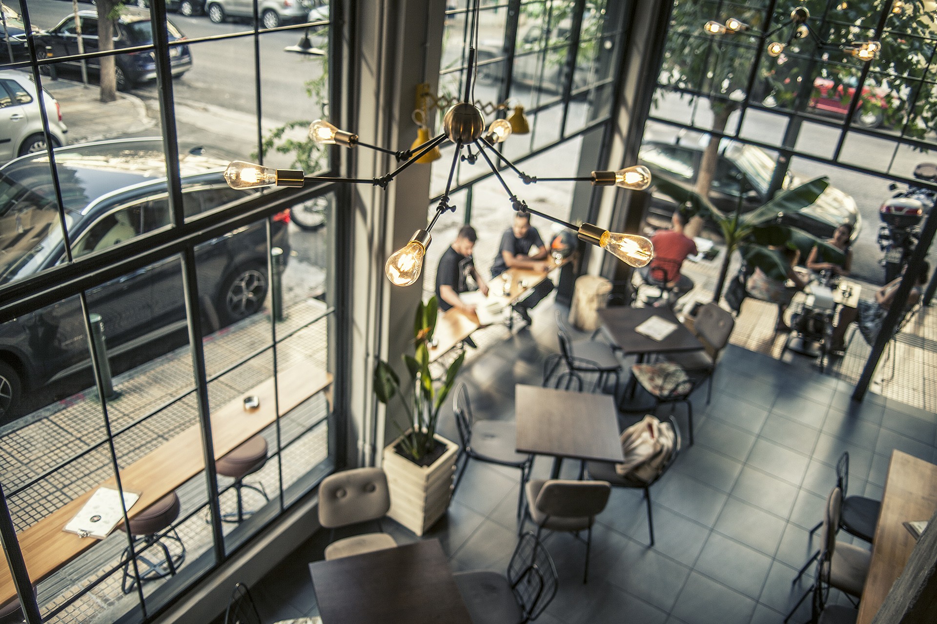 Οι τζαμαρίες που ανοίγουν συνδέοντας το εσωτερικό με το εξωτερικό περιβάλλον, το πολυμορφικό πατάρι του χώρου, το παρασκευαστήριο στο κέντρο του καταστήματος με τις γυμνές κολώνες σχεδιάστηκαν από το αρχιτεκτονικό γραφείο Triopton.