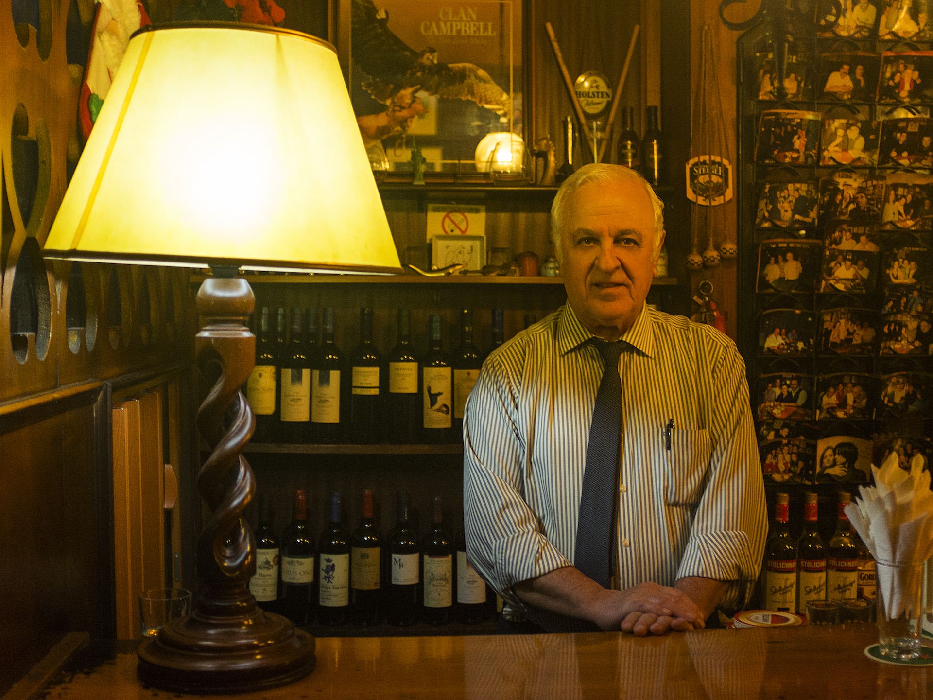 Δεν είναι εύκολο πράγμα να στηθεί σωστά μια μπάρα. Εδώ είναι όλα μελετημένα. Το ύψος της μπάρας, το μαξιλαράκι που είναι πολύ βασικό, ο περιβάλλων χώρος, η απόσταση της καρέκλας, η σιδερένια μπάρα για να ακουμπάνε τα πόδια σου… Είναι μία συνταγή που αν πετύχει, είναι ό,τι καλύτερο για τον πελάτη, για να περάσει την ώρα του ξεκούραστα. Όπως ξέρεις κιόλας οι δικές μας οι καρέκλες έχουν πλάτη, για να ακουμπάς και να ξεκουράζεσαι. Επίσης οι καρέκλες δεν μετακινούνται, είναι σταθερές, για να κάθεται ο άλλος και να έχει την ησυχία του. Μερικοί νέοι επειδή έχουν συνηθίσει από άλλα μπαρ που μετακινούνται οι καρέκλες, έρχονται εδώ και προσπαθούν να τις τραβήξουν. Το έχεις δει κι εσύ. Και πάω και τους λέω: «παιδιά οι καρέκλες δεν μεταφέρονται, μόνο περιστρέφονται». Επίσης η καρέκλα κανονικά πρέπει να κοιτάζει προς το μπαρ, όχι να είσαι γυρισμένος και να απλώνεις τα πόδια, να μη μπορεί να περάσει ο κόσμος. Είναι θέματα παιδείας αυτά.