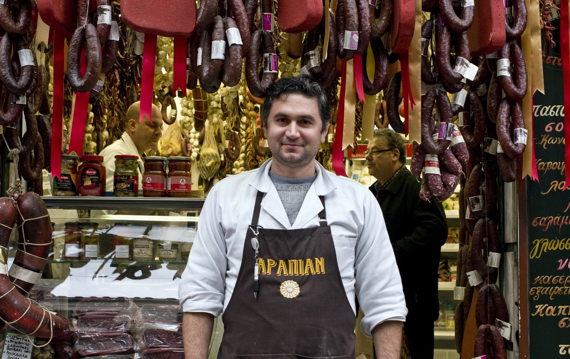 Η εταιρία μας ιδρύθηκε το 1935 από τον Σαρκίς Αραπιάν. Ήταν συνέταιρος με τον πατέρα μου. Ήρθε από την Πόλη έστησε ένα μικρό εργαστήρι στην παλιά Κοκκινιά και άνοιξε το μικρό κατάστημα στην Ευριπίδου, από όπου και ξεκίνησε να προμηθεύει τους Αθηναίους και την επαρχία με παστουρμά και σουτζούκι. Και ο παππούς μου ήταν από την πόλη. Όταν “‘έφυγε” ο Αραπιάν κράτησε ο πατέρας μου το μαγαζί, με την ίδια ονομασία και τώρα το συνεχίζω εγώ. Είμαι η τρίτη γενιά, ανέλαβα το 2002 αλλά παρ’ όλα αυτά είμαι εδώ από μικρό παιδί και την ξέρω πάρα πολύ καλά την γειτονιά. Από τα παιδικά μου χρόνια θυμάμαι όταν δεν είχα σχολείο ερχόμουν εδώ.