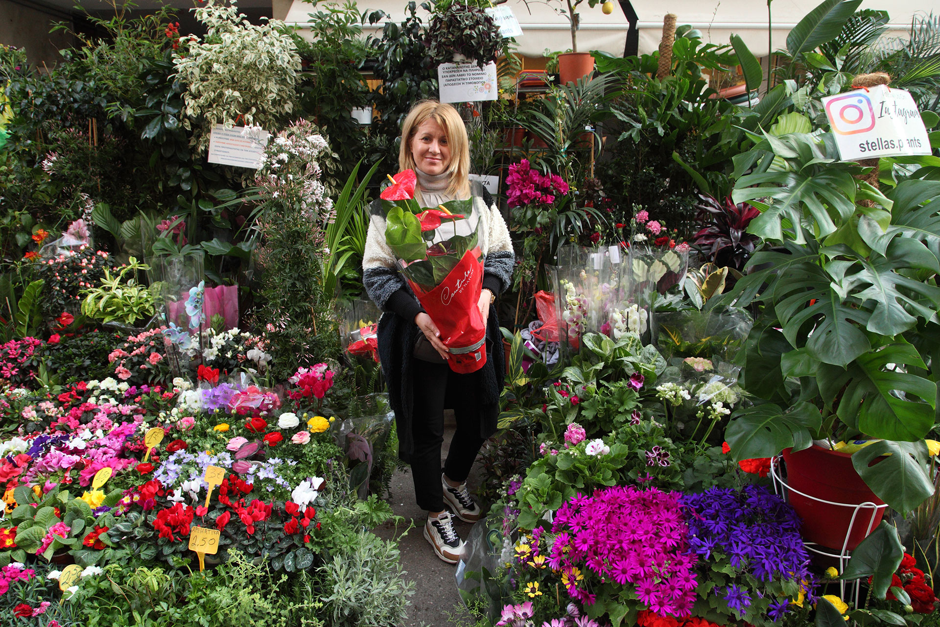 Η Στέλλα καλημερίζει τους πάντες, πολλούς τους ξέρει με το μικρό τους όνομα. Μου συστήνει την κυρία Σταυρούλα που είναι πελάτισσα 20 χρόνια. Λίγο μετά έρχεται μια οικογένεια, μου λέει με περηφάνια ότι έχουν έρθει από τον Πειραιά αποκλειστικά για εκείνη και χαρούμενη κάνει δώρο στον μικρό γιο ένα παχύφυτο, σε κόκκινο γλαστράκι γιατί είναι Ολυμπιακός.