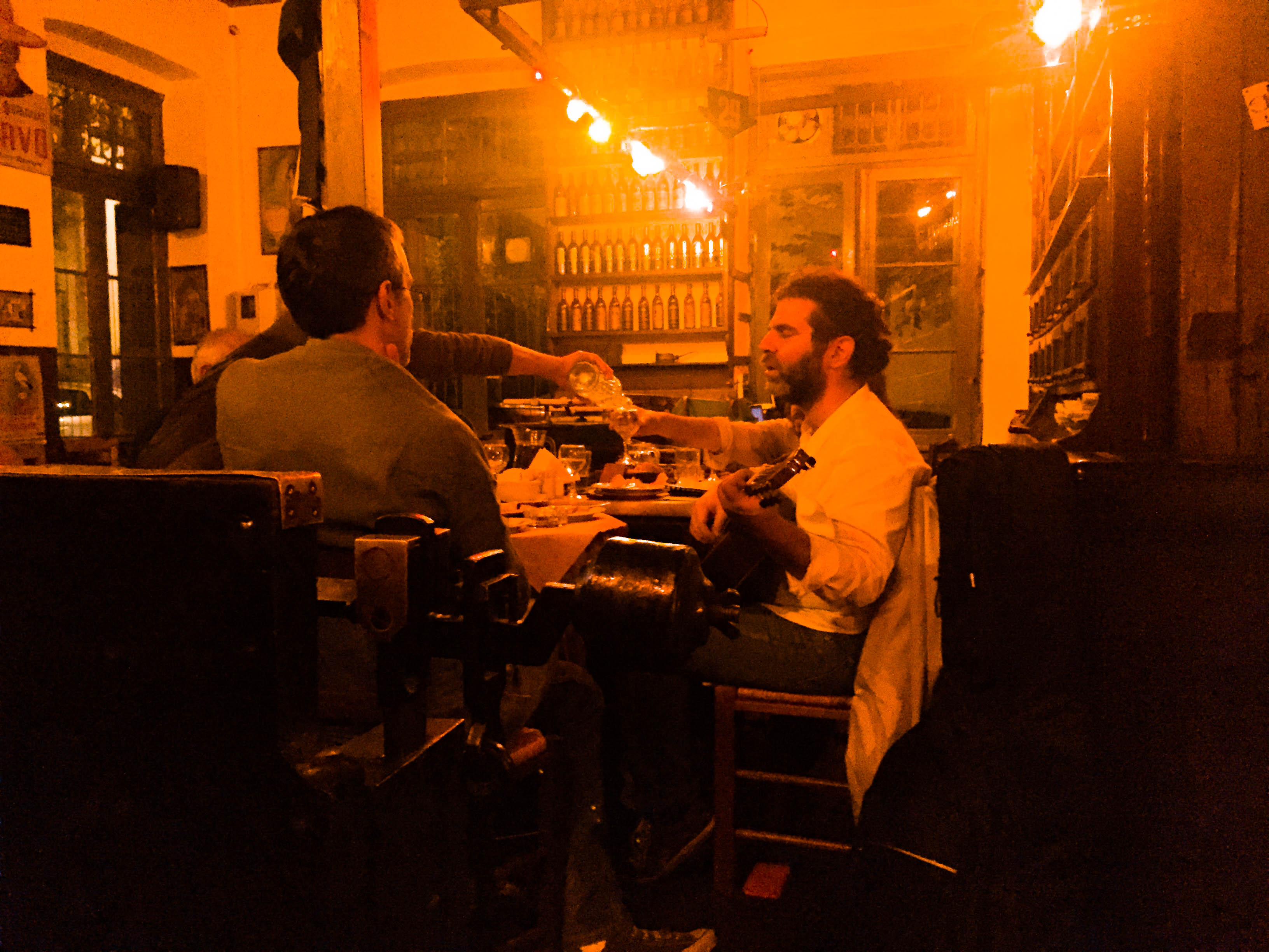 Και κάπου, κάποτε, μερικές φορές ή και συχνά (πάντως μάλλον σίγουρα Δευτέρα που δεν θα βρεθεί κάποιος σε ένα διπλανό τραπέζι να του ζητήσει το «Στα ίδια μέρη θα ξαναβρεθούμε» ή δεν έχουν reunion συμμαθήτριες που «έχουν πάρει απολυτήριο από τον καιρό του Μεσοπολέμου» όπως λέει και ο Ζήσης ο πολιτικός μηχανικός που έχει μεγαλώσει με το «Νέο Κύμα») θα εμφανιστεί μέσα στο σκοτάδι ο μουσικός Σπύρος Καβαλλιεράτος με το μαλλί αφάνα -σαν ρομαντικός τροβαδούρος άλλης εποχής (τον φαντάζομαι να παίζει τα βράδια μόνους του με τη κιθάρα του σε μια σκοτεινή πλατεία της Πάντοβα ή να κάνει καντάδες στο Ληξούρι circa 1920), θα κάτσει στο τραπέζι σου (όπως εχθές) θα πιάσει την κιθάρα του και θα σου παίξει μερικά αναπάντεχα τραγουδάκια όπως το «Je Reviens Toujour» των Χάνομαι γιατί Ρεμβάζω, την «Παναγία των Πατησίων» των Χατζιδάκι-Γκάτσου (με τον τρομερό στίχο «Μα εμένα μού `δωσε η ζωή λαχταριστές καμπύλες / που για τους άντρες άνοιγαν των ουρανών τις πύλες / και μού `λεγαν στενάζοντας καθώς με παίρναν πρέφα / «Εσύ κερδίζεις μάνα μου και κύπελλο Ουέφα») και ένα σερί με παραδοσιακά Επτανησιακά (λόγω καταγωγής) όπως τα «Μαύρα Μάτια» και το «Λάμπει μες στο γιαλό».