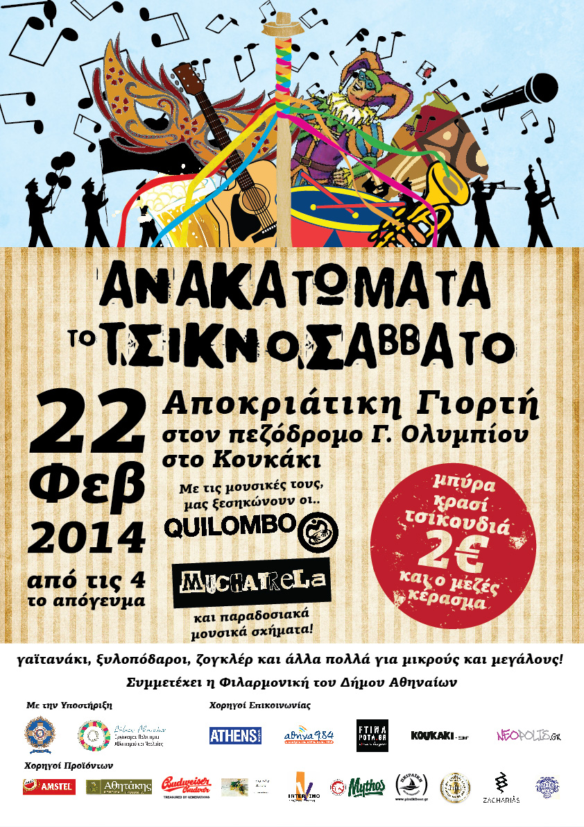 Μια από τις παλαιότερες γειτονιές το Κουκάκι, που κρατάει ακόμα και σήμερα την αυθεντικότητα του αναβιώνει τις Απόκριες. Όπως και πέρυσι έτσι και φέτος με την πρωτοβουλία των καταστηματαρχών του Πεζόδρομου Γ. Ολυμπίου, διοργανώνεται ένα μεγάλο αποκριάτικο γλέντι-καρναβάλι με σκοπό να βγει έξω ο κόσμος, να διασκεδάσει και παράλληλα να γνωρίσει την γειτονιά μας. Τα καταστήματα θα σας προσφέρουν μπύρα, κρασί και τσικουδιά στις χαμηλότερες τιμές (2 ευρώ) και θα σας κεράσουν τα σουβλάκια και τους μεζέδες.Με δρώμενα για τους μικρούς μας φίλους (αποκριάτικη παρέλαση από τα παιδιά της ομάδας μπάσκετ του Κουκακίου, διαδραστικά παιχνίδια , χειροτεχνία, κουκλοθέατρο, ξυλοπόδαρους και ζογκλέρ.)Ο Αθήνα 9.84 θα φροντίσει για τον ήχο και τη μουσική. Επίσης θα στηθούν και παραδοσιακά γα΄ι΄τανάκια από τους μαθητές της Βασίλως Ιωάννου. Ο Δήμος Αθηναίων μας παραχωρεί την Φιλαρμονική Μπάντα του, η οποία θα ανοίξει το μουσικό μέρος του προγράμματος, και πιο αργά το βράδυ σε όλο το μήκος του πεζόδρομου θα παίξουν ζωντανά οι κρουστοί ‘’Quilombo’’ σε βραζιλιάνικους ρυθμούς, οι Muchatrela σε gipsy-swing ήχους και άλλες πολλές μπάντες σε παραδοσιακούς αποκριάτικους σκοπούς από τη Θράκη, την Κοζάνη, την Ήπειρο κ.α