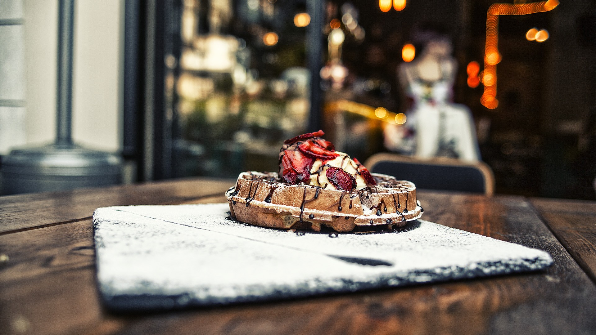 και μια χειροποίητη βάφλα με πραλίνα φουντουκιού, φράουλες και παγωτό ιταλικού τύπου