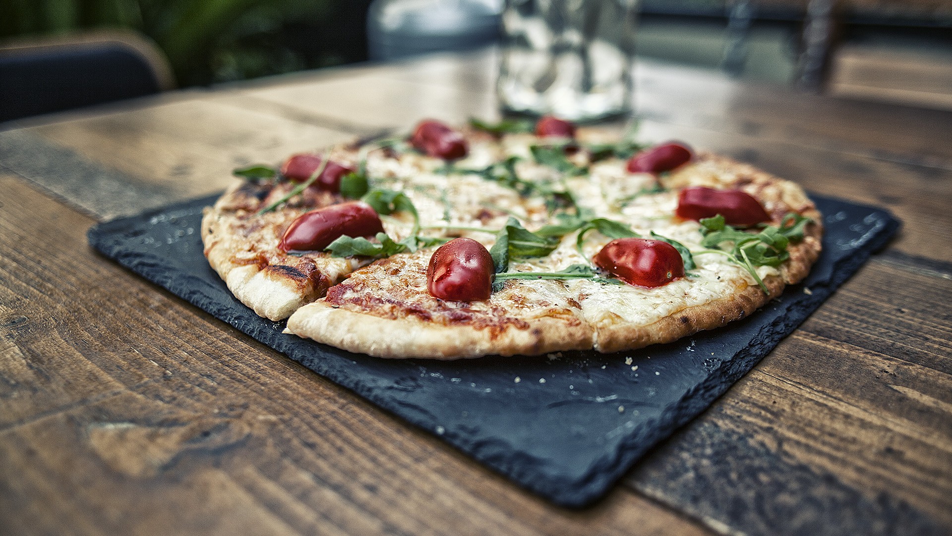 Χειροποίητη πίτσα ψημένη σε πέτρινη πλάκα με mozarella, καπνιστή γαλοπούλα, ντοματίνια και ρόκα
