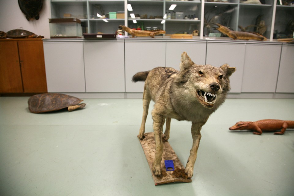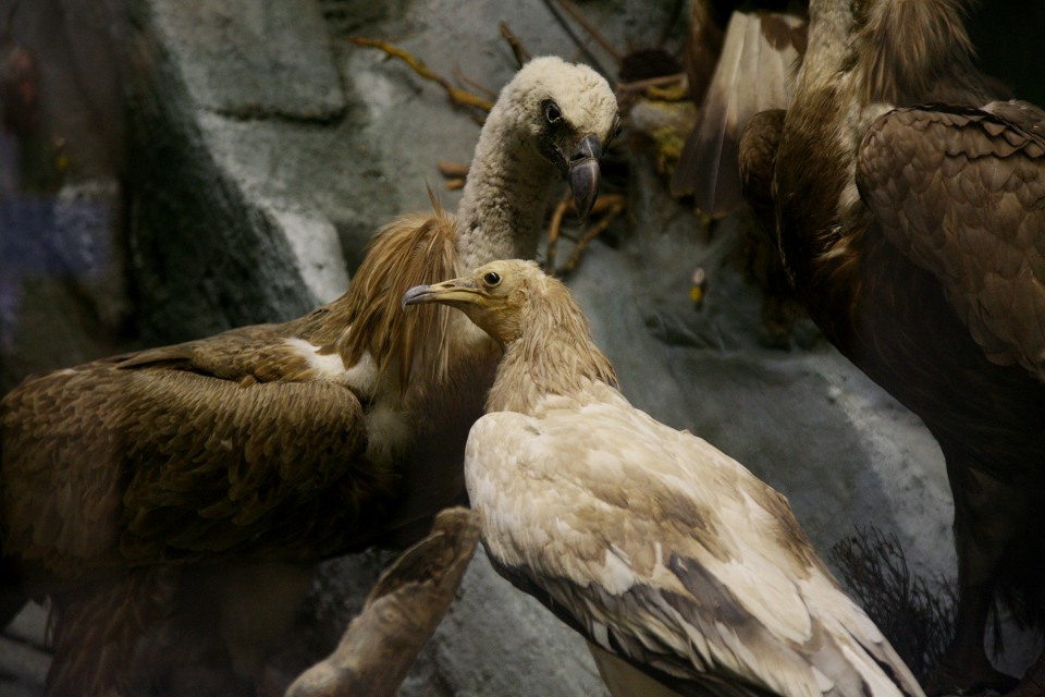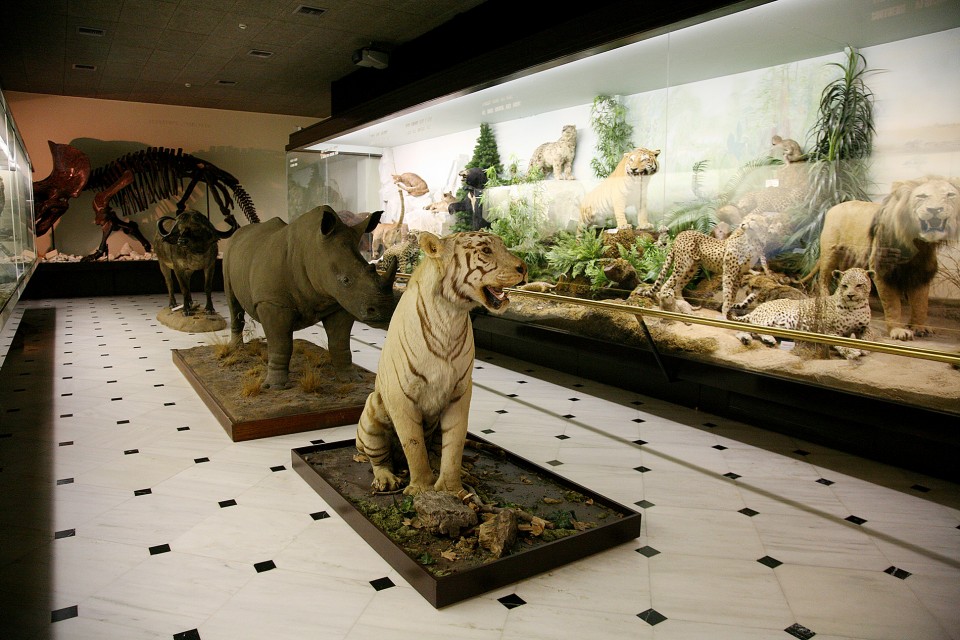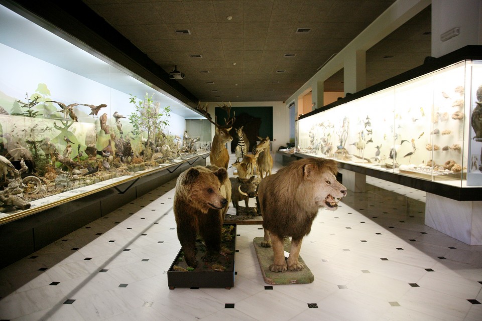 Το κόκκινο στρογγυλό αυτοκόλλητο που συχνά θα διακρίνεις πίσω από τις βιτρίνες υποδηλώνει πως το είδος που εκτίθεται σπανίζει, εξαιτίας των κλιματικών αλλαγών και της διάδρασης του σύγχρονου ανθρώπου με το οικοσύστημα. «Το κάθε είδος έχει προσαρμοστεί έτσι ώστε να ζει σε συγκεκριμένο βιότοπο και σε συγκεκριμένες κλιματικές συνθήκες. Για παράδειγμα, τα ερπετά προτιμούν τις θερμές περιοχές με ήπιο κλίμα. Όταν συμβούν σημαντικές κλιματικές αλλαγές τα ζώα δεν προλαβαίνουν να προσαρμοστούν σε αυτές και εξαφανίζονται από την περιοχή. Ο άνθρωπος πρέπει να μάθει να ζει μαζί με τη φύση και όχι εις βάρος της», εξηγεί η ζωολόγος καθώς μας δείχνει μια αρσενική αρκούδα που βρέθηκε νεκρή στην Εγνατία οδό και έναν μαυρόγυπα που αυτή τη στιγμή δε θα συναντήσεις πάνω από δέκα όμοιους του σε ολόκληρη τη χώρα.