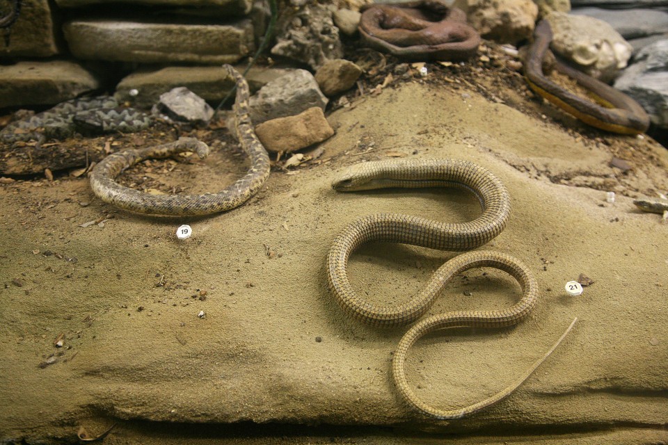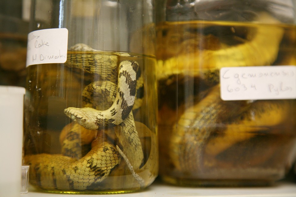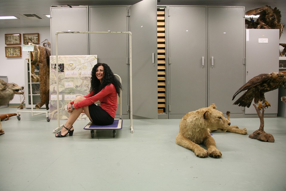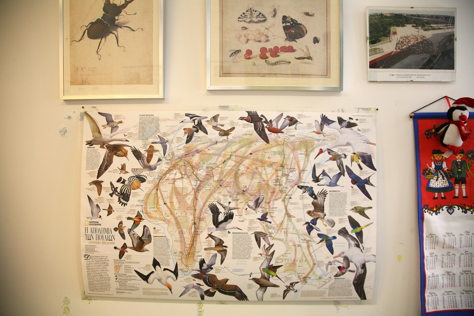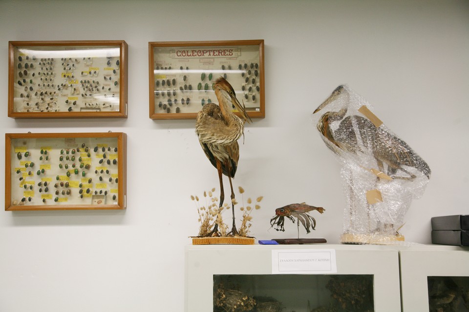 Την ξενάγησή μας στο μουσείο που ξεκίνησε ως βοτανικό -και μερικά χρόνια αργότερα επέκτεινε τις συλλογές του στους τομείς της ζωολογίας, της παλαιοντολογίας και της γεωλογίας- ανέλαβε η Μαρία Δημάκη, βιολόγος με διδακτορικό στην οικολογία των ερπετών και συγκεκριμένα στους χαμαιλέοντες. Ως παιδί παρατηρούσε τα μυρμήγκια να μεταφέρουν σπόρους στη φωλιά τους και τα χελιδόνια να ταΐζουν τα μικρά τους. Σήμερα εργάζεται στο εργαστήριο του Τμήματος Χερσαίας Ζωολογίας περιτριγυρισμένη από ντουλάπια γεμάτα διάφανα βάζα με ερπετά και αμφίβια, ενώ συχνά φτιάχνει βαλίτσες και ταξιδεύει σε διάφορα μέρη ανά την Ελλάδα προκειμένου να πραγματοποιήσει έρευνα πεδίου. Ένα ασημί μικροσκοπικό δαχτυλίδι πάνω στο γραφείο της τραβά την προσοχή μας. «Με αυτό παρακολουθούμε την πορεία μετανάστευσης των αποδημητικών πουλιών. Την άνοιξη και το φθινόπωρο πιάνουμε μερικά από αυτά σε ειδικά δίχτυα και τους βάζουμε αυτό το δαχτυλίδι με τον κωδικό του μουσείου στο πόδι. Κατόπιν τα αφήνουμε ελεύθερα και σε περίπτωση που τα βρει κάποιος οπουδήποτε στον κόσμο μπορεί να επικοινωνήσει μαζί μας. Κάπως έτσι έγινα φίλη με έναν Ούγγρο που συνάντησε τρία αποδημητικά που είχαν δακτυλιωθεί από εμένα, ενώ κάποια στιγμή στη Σάμο βρήκα η ίδια ένα παρόμοιο δαχτυλίδι και πληκτρολογώντας τον κωδικό ανακάλυψα πως προερχόταν από ένα μουσείο στη Ζάμπια».