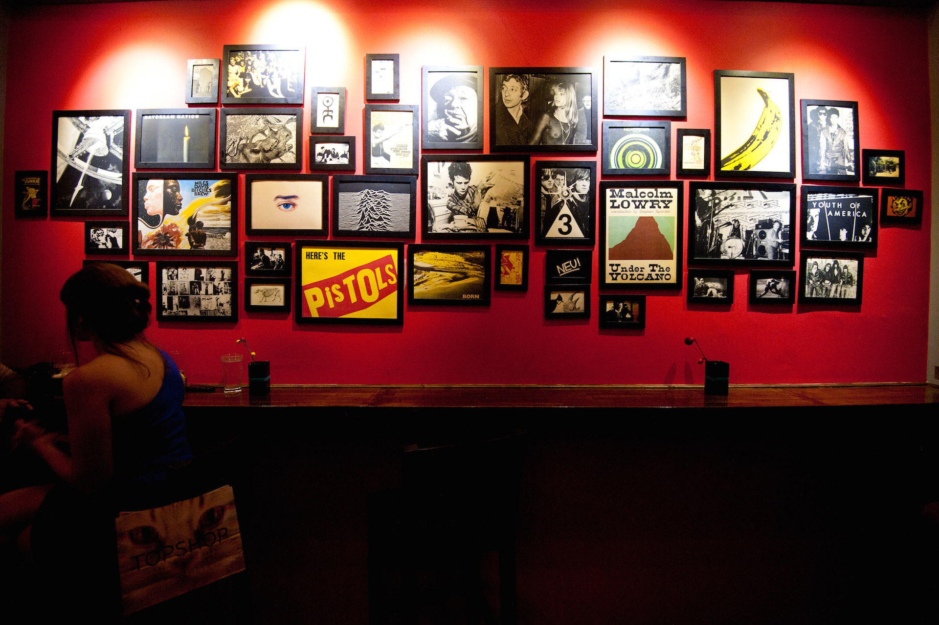 Με το που μπαίνει κανείς στον Ρινόκερω τα κάδρα που βρίσκονται στον δεξί τοίχο του τραβούν την προσοχή. Η επιλογή τους δεν είναι καθόλου τυχαία καθώς δίνουν το μουσικό, και όχι μόνο, στίγμα του μαγαζιού. Έχουμε και λέμε, από μουσική: Einstürzende Neubauten, Neu, Suicide, Wire, Black Angels, Birthday Party, Sonic Youth, Wipers, Ramones, Joy Division, Public Enemy, Spacemen 3, Triffids, Clash, Sex Pistols, Hendrix, Miles Davis, Serge Gainsbourg & Jane Birkin, από θέατρο: Ιονέσκο, από σινεμά: Kubrick (Οδύσσεια…), από λογοτεχνία: Burroughs, Bradbury, Lowry και από ζωγραφική: Dali και λεπτομέρειες από το χαρακτικό Ρινόκερως του Dürer. Πήρατε μια γεύση, έτσι δεν είναι;