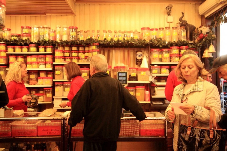 O λόγος για το ταξίδι στον πλανήτη Ευριπίδου υπήρξε το «Μπαχάρ» στον αριθμό 31. Πρατήριο μπαχαρικών, βοτάνων, αιθέριων ελαίων, αποξηραμένων λαχανικών και δημητριακών που λειτουργεί από το 1940 και ό,τι ώρα και να περάσεις από έξω, θα αντικρίσεις μια τεράστια ουρά που φτάνει μέχρι το διπλανό κατάστημα με φυτά και ακόμα πιο πίσω. Μια κυρία και ένας άνδρας έχουν πιάσει την κουβέντα, όσο περιμένουν. Τους ρωτώ τι είναι εκείνο που βρίσκουν στο «Μπαχάρ» και στήνονται στην ουρά σαν να περιμένουν στα ιατρεία του ΕΟΠΥΥ. «Η ασύγκριτη ποιότητα», μου λένε σχεδόν με μια φωνή και ο μεσήλiξ κύριος δηλώνει 40 χρόνια πελάτης. «Και οι τιμές είναι καλές, όμως και ένα ευρώ παραπάνω να το βρεις αυτό που ζητάς σε σχέση με το απέναντι μαγαζί για παράδειγμα, αξίζει. Πας στα αλλά και είναι μες τα ζουζούνια», συμπληρώνει μια συμπαθέστατη ηλικιωμένη κυρία που ακούει τη συζήτηση μας, η οποία έρχεται από την Κυψέλη τουλάχιστον μια φορά το μήνα για να προμηθευτεί γλυκάνισο. Στο κατάστημα υπάρχουν περισσότερα από 2.500 καταμετρημένα είδη. Το κορυφαίο σχόλιο όσων περιμένουν στοιχισμένοι σαν σε σχολική εκδρομή, είναι ότι πρόκειται για το αγαπημένο μαγαζί του Βασίλη Καλλίδη, αλλά και άλλων διάσημων τηλεοπτικών σεφ όπως ο Λαζάρου και ο Σκαρμούτσος. Ίσως αυτό να τραβά τους νεότερους στο «Μπαχάρ» σαν μαγνήτης, που στην πλειονότητά τους βρίσκονται εκεί για να αγοράσουν τζίντζερ, το οποίο χρησιμοποιούν πλέον στα φαγητά τους και θα το βρεις εκεί προς 10 ευρώ το κιλό.