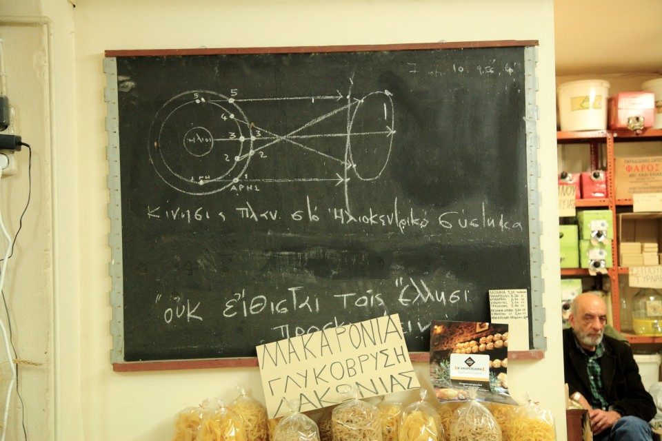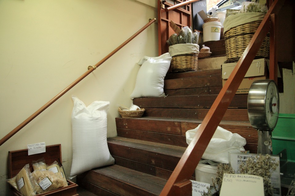 Δίπλα από ένα ακόμη κατάστημα με όσπρια, βρίσκεται ένα νεοκλασικό. Η είσοδός του δεν παραπέμπει σε κατοικήσιμη οικία, αν όμως σηκώσεις το βλέμμα ψηλά, θα δεις γλάστρες στο μπαλκόνι και μια ξεφτισμένη ελληνική σημαία να κυματίζει. Χτυπάω το κουδούνι με την ελπίδα ότι κάποιος θα ανοίξει, όμως δεν απαντά κανείς. Ο κύριος Βαγγέλης, από το δίπλα κατάστημα με αποθαρρύνει «Τώρα θα ‘χει πιει τα κρασιά του, θα χει πέσει για ύπνο. Είναι λίγο περίεργος και αρκετά ηλικιωμένος. Μένει εδώ με τη γυναίκα του. Απέναντι ίσως βρεις κάποιον».