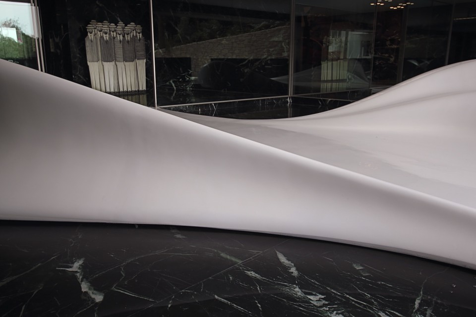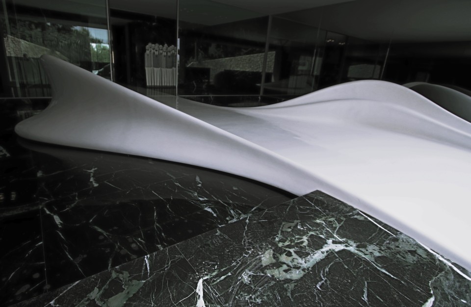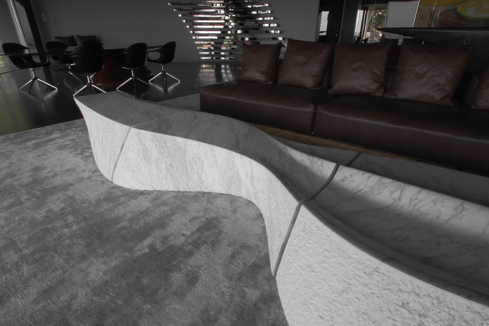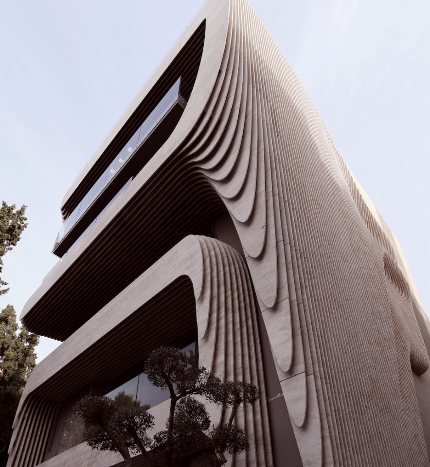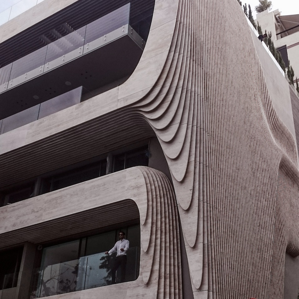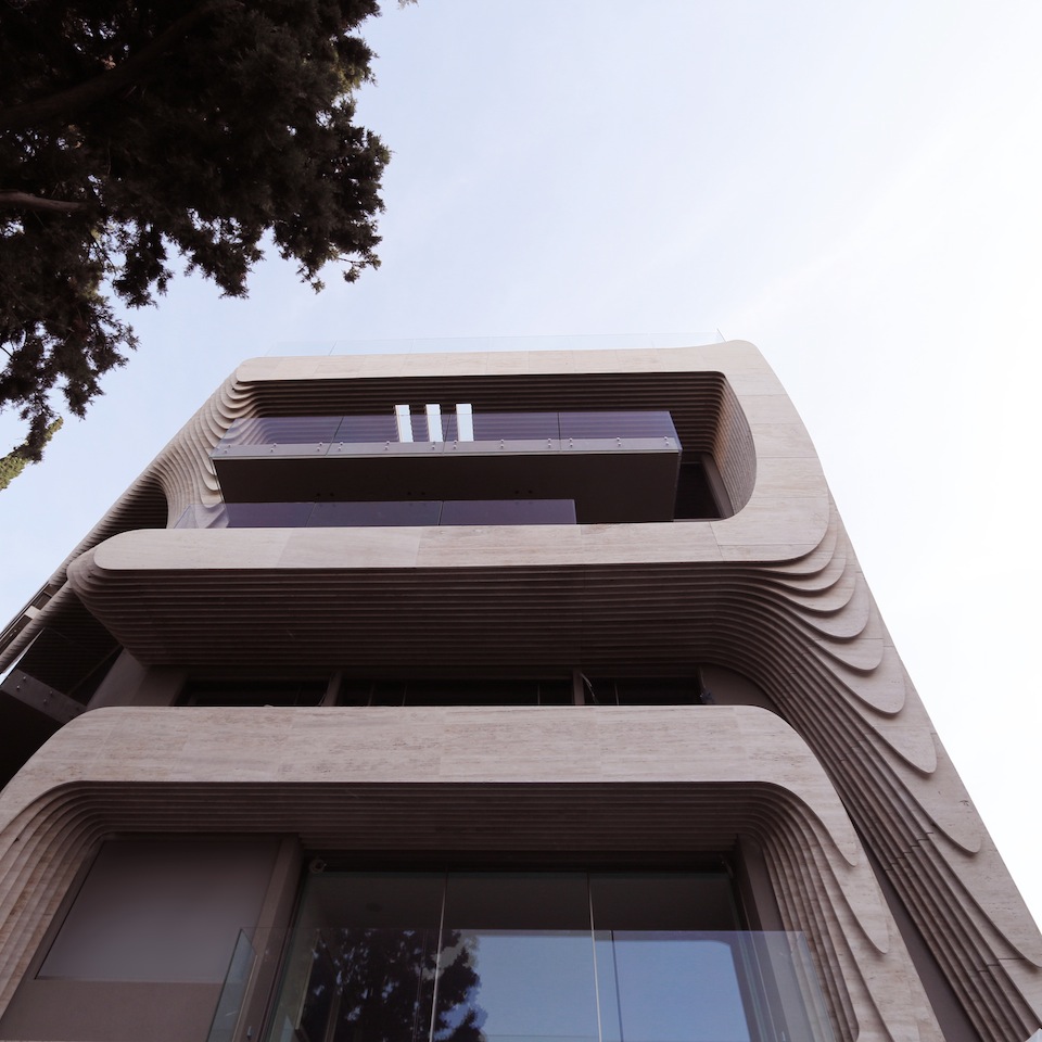 Στην πλευρά του οικοπέδου που συνορεύει με το δάσος, το κτίριο εναρμονιστηκε γεωμετρικά με τη φυσιολογια του λόφου. Ένας παλιός τοπογραφικός χάρτης της περιοχής υπήρξε η έμπνευση της γεωμετρικής διαχειρισης. Η αισθητική των ισοϋψών καμπυλών του χάρτη αποτέλεσε την πηγή της αρχιτεκτονικής «μεταφοράς». Δημιουργήθηκε ένα ψηφιακο τοπίο στην πρόσοψη με ομαλές προεξοχές και εσοχές οι οποίες καλύπτουν τις κυβικές μορφές των εξωστών και δημιουργουν μια φυσική κλιμακωση. Έπειτα, το τοπίο αυτό τμήθηκε με πολλαπλές τομές σε ακολουθία, οι οποίες αποτέλεσαν τα τμήματα του συστήματος επένδυσης. Ως προς τα υλικά το πορολιθικό μάρμαρο Travertino ήταν η ιδανική επιλογή χάρη στη χρωματική αρμονία του με τους πετρόχτιστους τοίχους αντιστήριξης του Λυκαβηττού. Παράλληλα, έχει χρησιμοποιηθεί εκτενώς στις πολυκατοικίες της δεκαετίας του ’70 χαρακτηριστικες στο Κολωνακι, όπως άλλωστε και στο γειτονικό κτίριο.