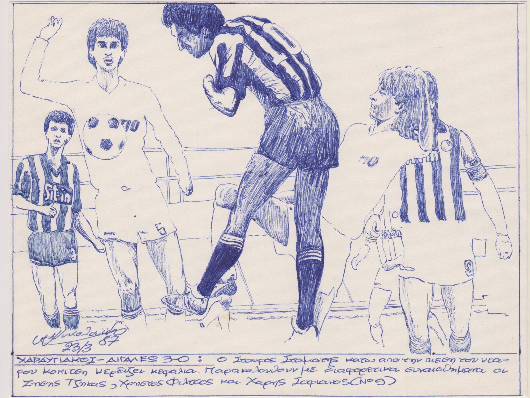 Φανταστική σχεδιαστική σύνθεση από την αγωνιστική πορεία του αείμνηστου σέντερ-φορ του Ατρόμητου Πειραιά, του Αιγάλεω και πολλών άλλων ομάδων, Χρήστου Χατζησκουλίδη.