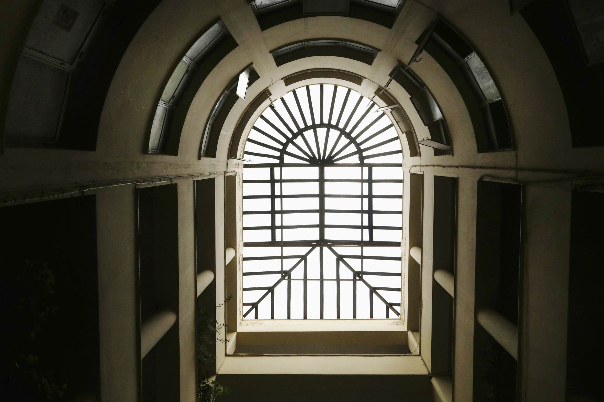 Όσοι έχετε βρεθεί στο αίθριο της διασωσμένης πολυκατοικίας, μάλλον θα έχετε κοιτάξει προς τα πάνω, προς το θολωτό μεταλλικό γεωμετρικό αρχιτεκτόνημα που το πρωί αφήνει το φυσικό φως να διαχέεται ομοιόμορφα σε τέσσερις ορόφους.