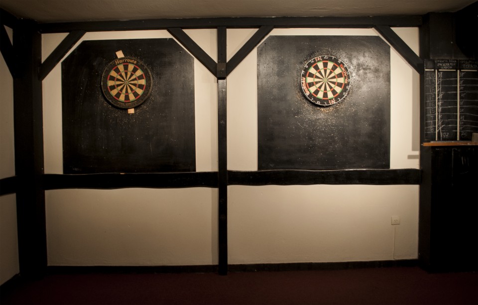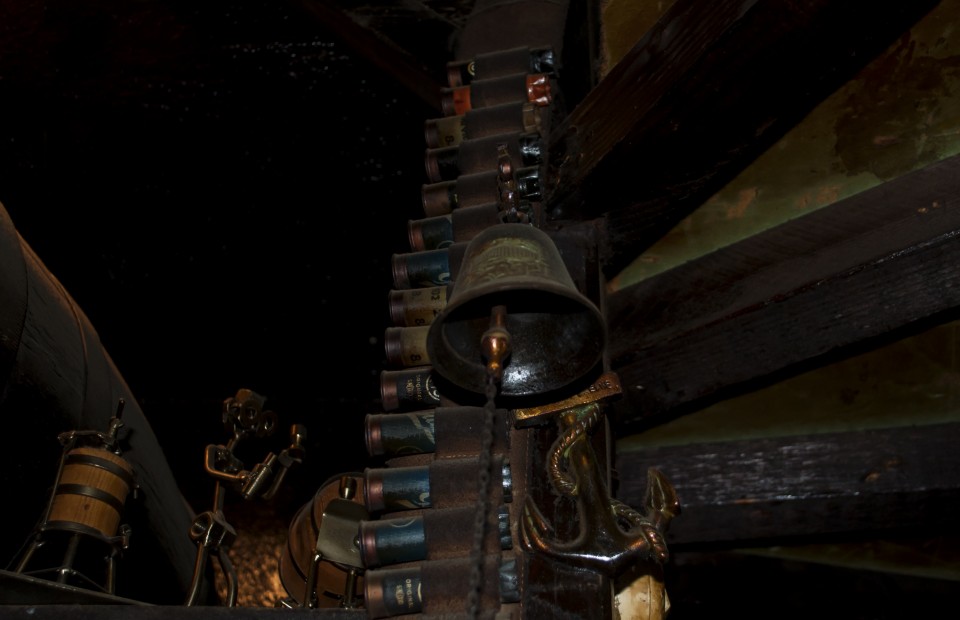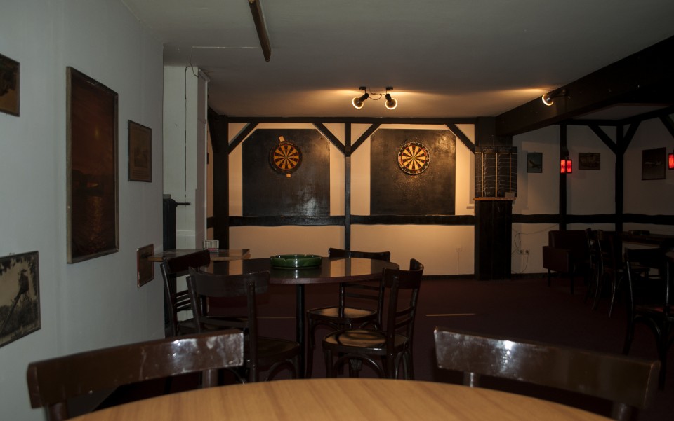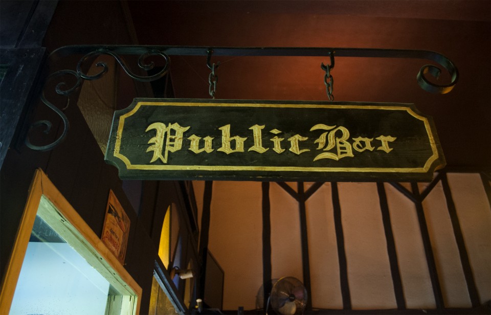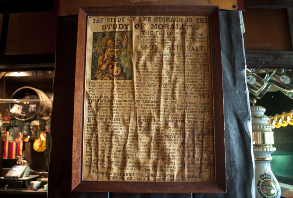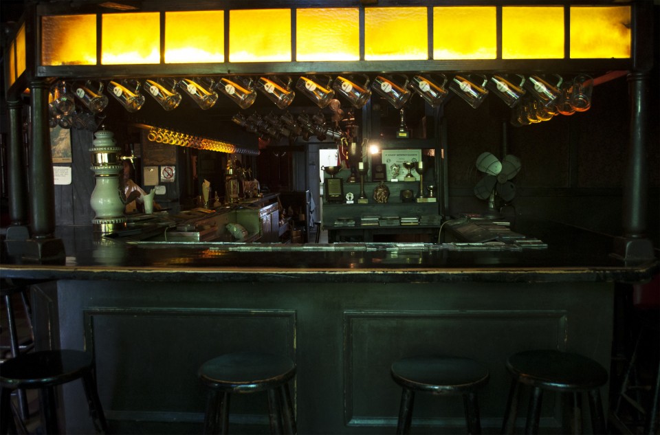 Πίσω από το μπαρ, κρέμεται από το ταβάνι μια περίεργη, μακρόστενη φιάλη. Αυτή είναι μια παμπάλαια φιάλη, υπολογίζω ότι είναι 120 ετών και δεν υπάρχει άλλη τέτοια στην Ελλάδα, που χωράει μια γιάρδα μπίρας δηλαδή περίπου 3 pints. Η πρόκληση είναι να το πιει κάποιος χωρίς να πάρει ανάσα, μονορούφι δηλαδή. Το έχουν καταφέρει εδώ μέσα λίγοι Ιρλανδοί και Εγγλέζοι. Η μπίρα που μπαίνει εκεί είναι μια συγκεκριμένη χωρίς ιδιαίτερη σπιρτάδα αλλιώς δεν αντέχεται. Να εκεί δίπλα βλέπεις το καμπανάκι, το χτυπάμε στο last call, όχι βέβαια ότι τα ωράρια είναι Αγγλίας, εδώ χτυπάει κατά τις 3:30, ίσως και 4». Ενώ μιλάει για το καμπανάκι ξαφνικά χώνεται πίσω από την μπάρα και εμφανίζεται με δυο φωτογραφίες με κορνίζες στα χέρια. Η μία απεικονίζει τον Παπαθεμελή και η άλλη τον Αλογοσκούφη «Τις έχω για όταν θέλουν να εκτονωθούν οι πελάτες» και ο νοών νοείτω.