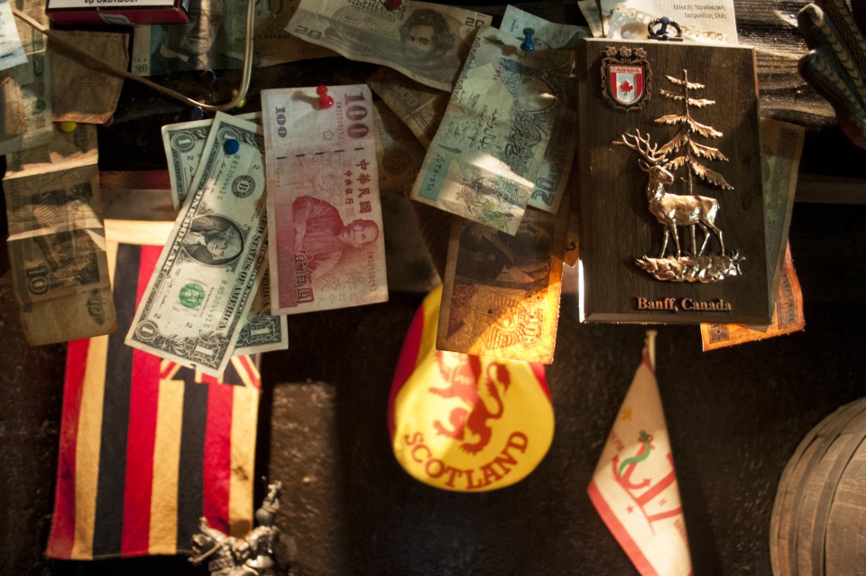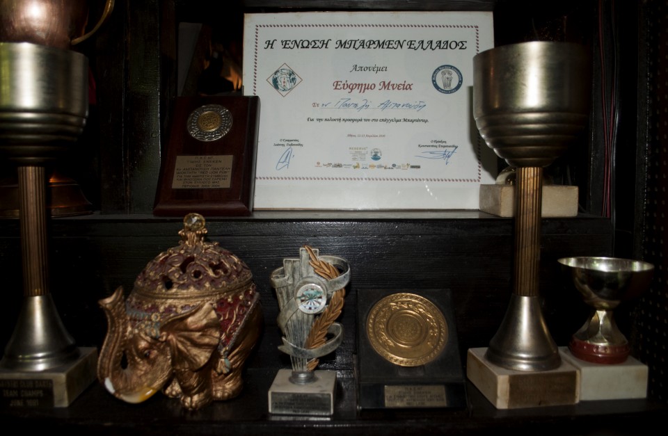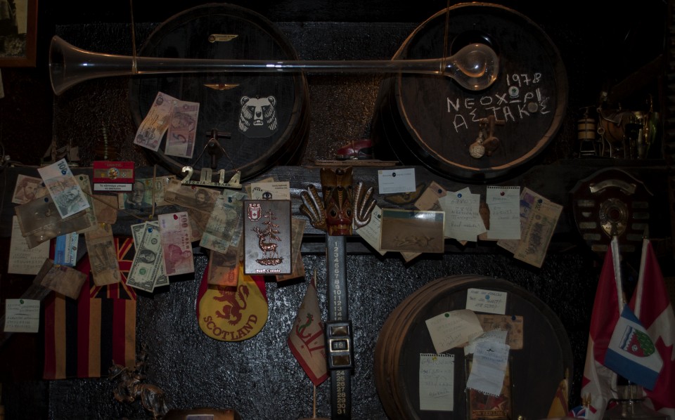 Πίσω από την μπάρα, κρεμασμένα στον τοίχο διακρίνονται πάμπολλα σπιρτόκουτα και χαρτονομίσματα σχεδόν απ’ όλο τον κόσμο «Ειδικά τα πληρώματα των αεροπορικών αλλά και επιχειρηματίες που είχαν δουλειές τακτικά στην Ελλάδα ερχόντουσαν συνέχεια και μου έφερναν σουβενίρ από τις πατρίδες τους και τα ταξίδια τους».