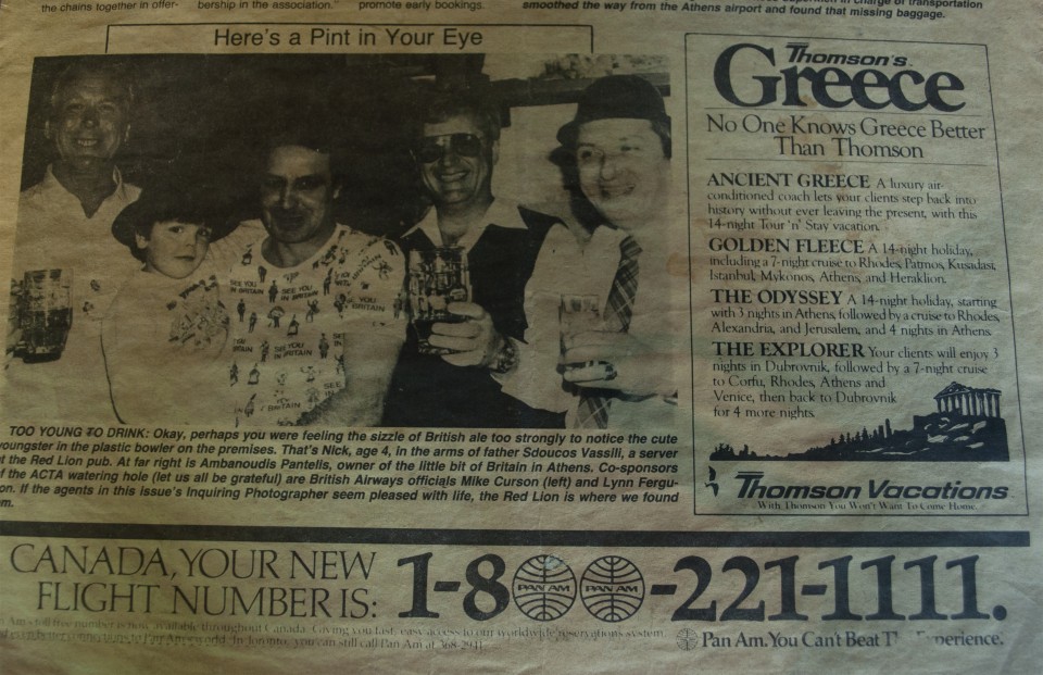 Κάθε μέρα μέσα στη Red Lion δεν ένιωθε ποτέ την ανάγκη να κάνω κάτι άλλο; «Μα ταξίδευα πολύ. Έπαιρνα ένα σακίδιο και γυρνούσα την Ευρώπη, συνάντησα φοβερά παιδιά έτσι. Η πιο περίεργη ιστορία είναι όταν είχα ένα ατύχημα με το αυτοκίνητο μου στην Αυστρία και πήγα στο συνεργείο, μου το επισκεύασαν και δεν μου ζήτησαν ποτέ λεφτά. Παραξενεύτηκα γιατί οι Αυστριακοί έχουν τη φήμη του σφιχτού πάντως κι εγώ δεν ρώτησα πολλά πολλά, τους ευχαρίστησα πήρα το αυτοκίνητο και έφυγα. Μετά άνθρωποι που είχα γνωρίσει στα ταξίδια όταν ερχόντουσαν στην Ελλάδα περνούσαν από εδώ για να πιουν, να φάνε και να με δουν. Πολλοί επίσης ερχόντουσαν από Καναδά. Έχω ζήσει μοναδικές εμπειρίες εκεί. Έχω δει το Βόρειο Σέλας. Έχω ζήσει σε κοινότητα Mi’kmaqs, μια φυλή Ινδιάνων του Καναδά, αγνοί άνθρωποι και έμαθα πολλά από αυτούς».