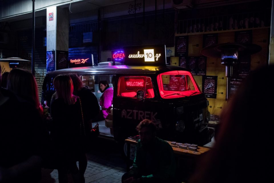 Εκεί μας περίμενε και το ειδικά φτιαγμένο για την περίσταση pop-up store του Sneaker10, φωτισμένο από neon επιγραφές και ρετρό τηλεοράσεις, όπου μπορούσαμε να δοκιμάσουμε επί τόπου τα νέα Reebok Aztrek σε τέσσερα διαφορετικά colorways. Όσοι αγόρασαν το δικό τους ζευγάρι έμπαιναν στο πάρτι δωρεάν παρέα με ένα φίλο τους, χωρίς αναμονή. Καθόλου άσχημα δηλαδή!