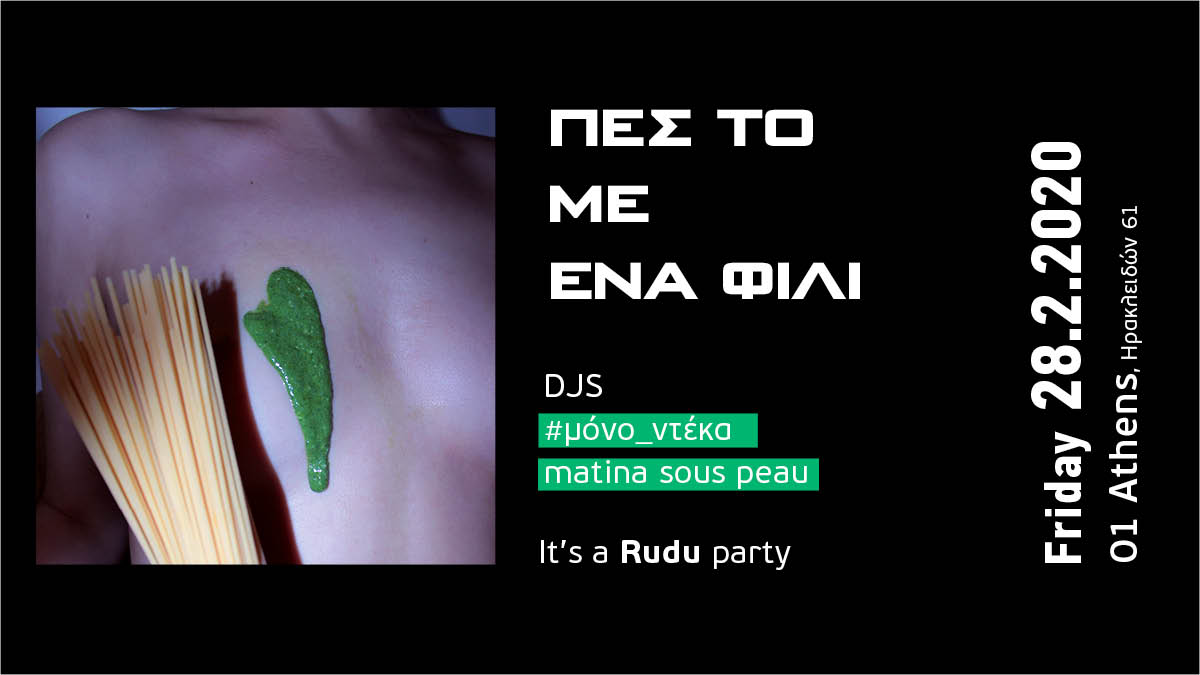Το μεγαλύτερο αποκριάτικο πάρτυ έρχεται την Παρασκευή 28/2/2020 από το Rudu Bar. Το Rudu «αυξάνεται» και για ένα βράδυ «περνάει απέναντι» στον πολυχώρο του club «01 Athens» (Ηρακλειδών 61, Μετρό Κεραμεικός).