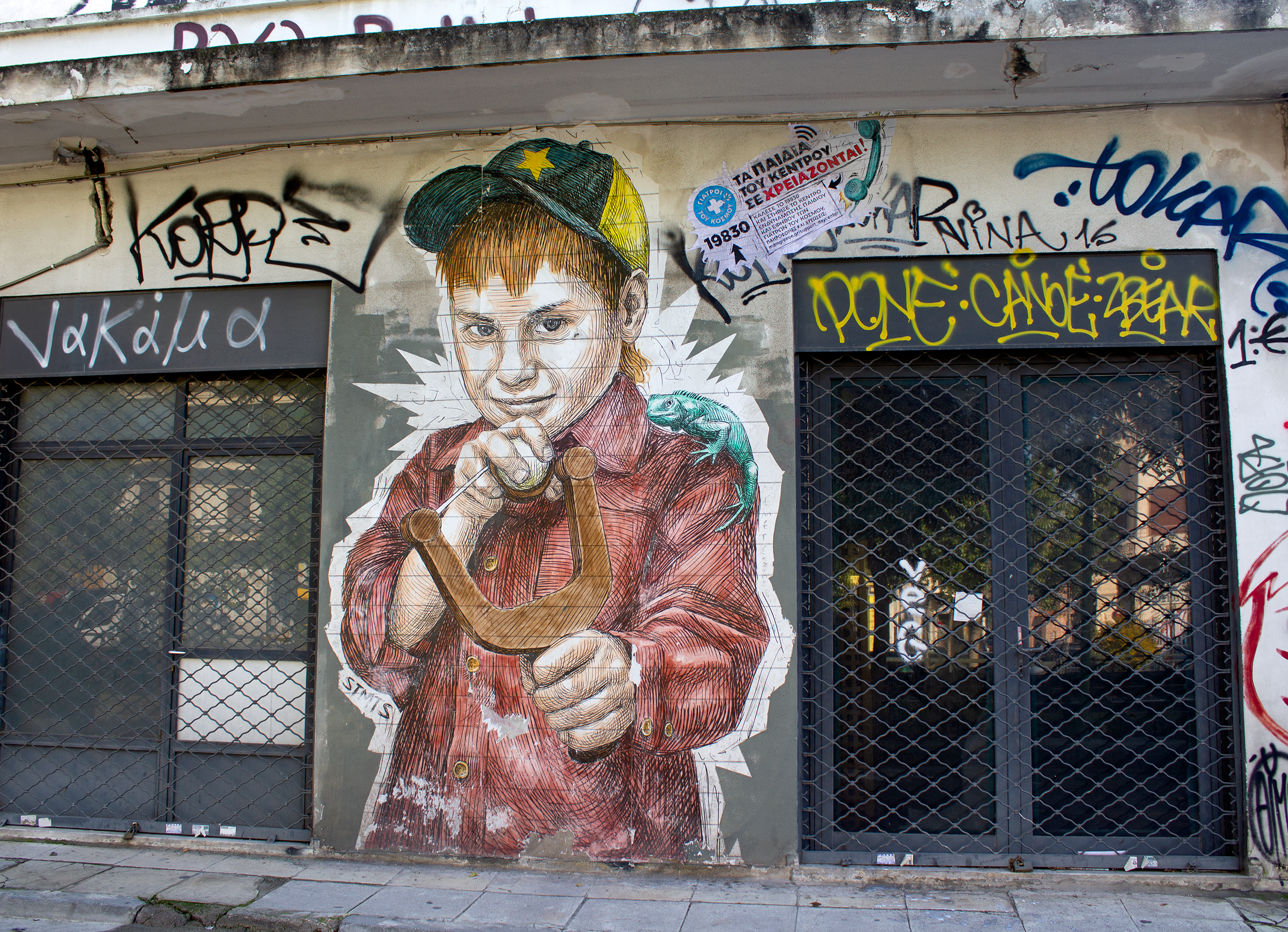 Τι σε έκανε να μεταφέρεις την τέχνη σου από το χαρτί στην μεγάλη επιφάνεια; Η έμπνευση που μου δίνει από μικρή ηλικία η πόλη της Αθήνας και γενικότερα το αστικό τοπίο. Ιδιαίτερα με τα χρόνια της οικονομικής κρίσης στην Αθήνα βλέπουμε κλειστά μαγαζιά και εγκαταλελειμμένα κτίρια με ακαλαίσθητους τοίχους, που μας προκαλούν κατάθλιψη και μιζέρια. Μου αρέσει κάνοντας μια εικαστική παρέμβαση να προσπαθήσω να τους ομορφύνω, αλλά παράλληλα να περνάω κάποια μηνύματα και να επικοινωνώ κάποιες ιδέες και σκέψεις με τους περαστικούς. Η άμεση επαφή του οποιουδήποτε ανθρώπου στην καθημερινότητα του με το έργο είναι κάτι που μου αρέσει και με εξιτάρει.