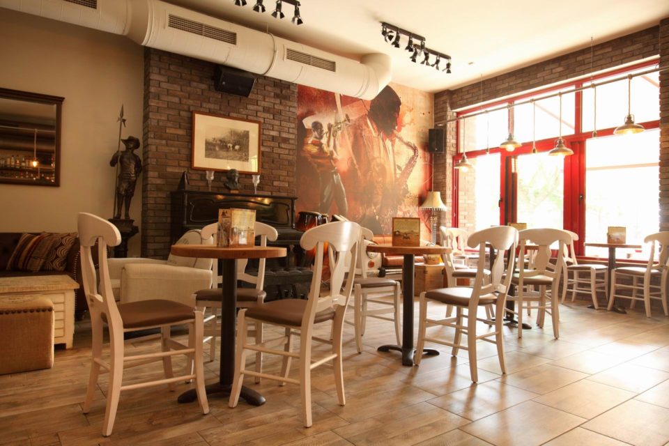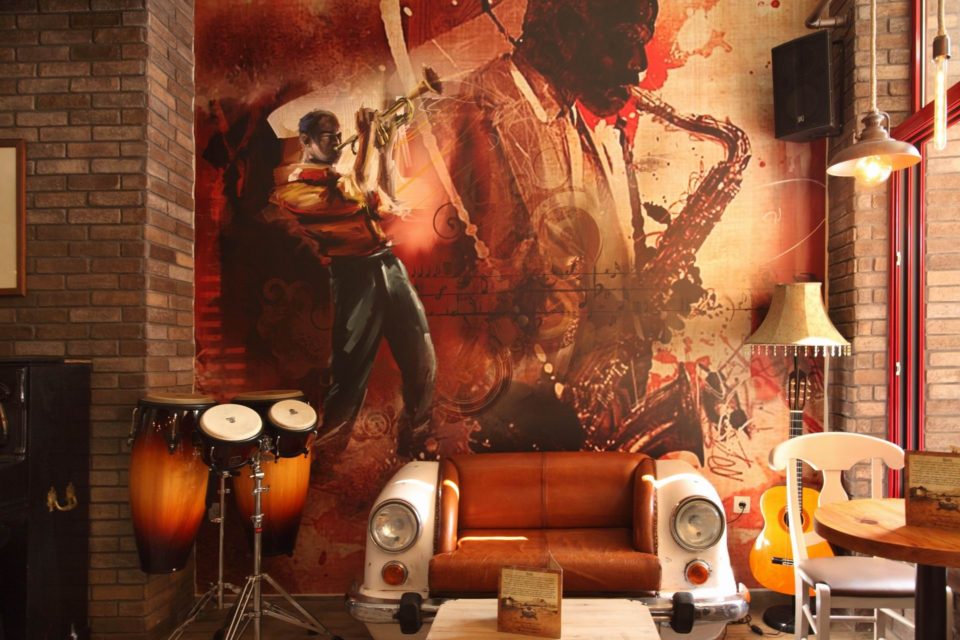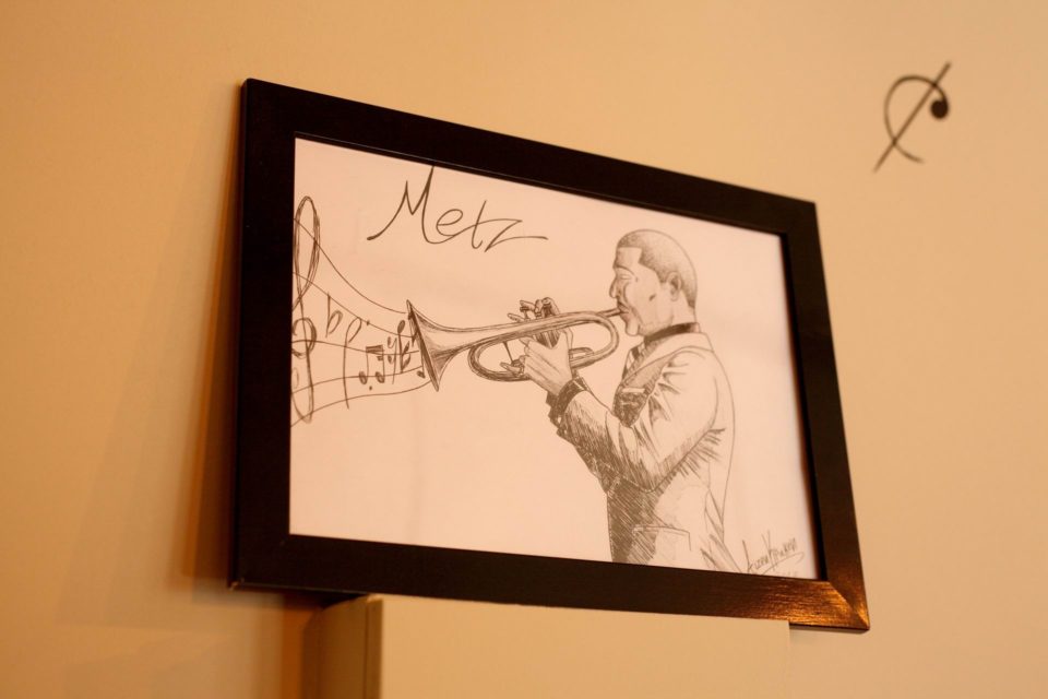 Καθώς όμως σιγά σιγά μαζευόμαστε προς τα μέσα, καθώς η θερμοκρασία κατεβαίνει, το εσωτερικό του Metz μας υποδέχεται με εξωτική αλλά και cozy διάθεση. Τo Metz αγαπάει την καλή μουσική και προτιμάει την τζαζ και γενικότερα τα μαύρα ακούσματα. Η διακόσμηση σε προϊδεάζει για αυτήν την προτίμηση με την τοιχογραφία ενός σαξοφωνίστα κι ενός τρομπετίστα να δεσπόζει πάνω από τον εντυπωσιακό καναπέ σε σχήμα αυτοκινήτου. Δίπλα ακριβώς τα congas αλλά κι ένα παλιό μαύρο πιάνο δίνουν θεατρικότητα στο σκηνικό υπογραμμίζοντας ότι η μουσική είναι μία από τις κυρίαρχες αξίες του χώρου.