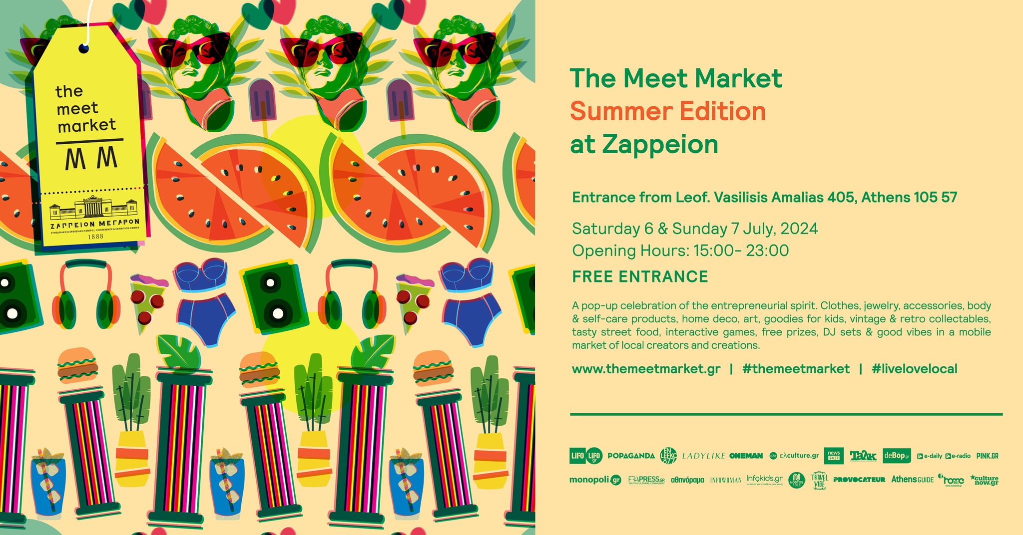Μία ανάσα πριν τις διακοπές, έρχεται το πιο δροσερό event της πόλης. Kαι αυτό το καλοκαίρι, μετά από το περσινό επιτυχημένο ντεμπούτο του, το Meet Market, η αγαπημένη νομαδική αγορά καινοτομίας και δημιουργικότητας, κατεβαίνει ξανά στην καταπράσινη όαση του Ζαππείου και στήνει την πιο καλοκαιρινή γιορτή.