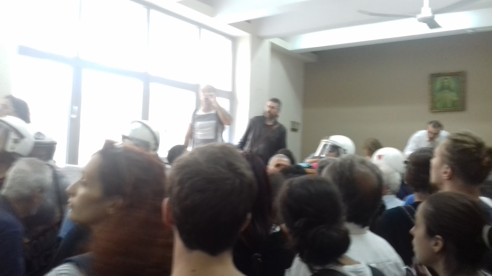 Σύμφωνα με όσα έζησε την Τετάρτη 5/10 ο κ.Σμήλιος, «από την πλευρά της Αστυνομίας, είχαμε την απόλυτη παρανομία: με το που φτάσαμε εκεί, μας ενημέρωσαν πως έχουν προφορική εντολή εισαγγελέα να μπούμε μέσα μόνο με καταγραφή προσωπικών στοιχείων και μόνο όσοι χωράνε στις αίθουσες. Οι πλειστηριασμοί όμως είναι δημόσια διαδικασία. Κάποιοι όντως καταφέραμε να μπούμε με απλή επίδειξη ταυτότητας αλλά σύντομα άρχισαν κι αυτό να το σταματάνε. Όταν διαμαρτυρηθήκαμε, ορμήσανε τα ΜΑΤ, προκαλώντας ένα επεισόδιο, που λίγο αργότερα σταμάτησε. Ωστόσο, η διαδικασία είχε ήδη ξεκινήσει. Απ’ έξω, για όσους δεν κατάφεραν να μπουν, φυσικά έγινε ακόμη περισσότερος χαμός: χτυπήσανε τον διαδηλωτή που συνέλαβαν με κατηγορία απόπειρας σωματικής βλάβης.