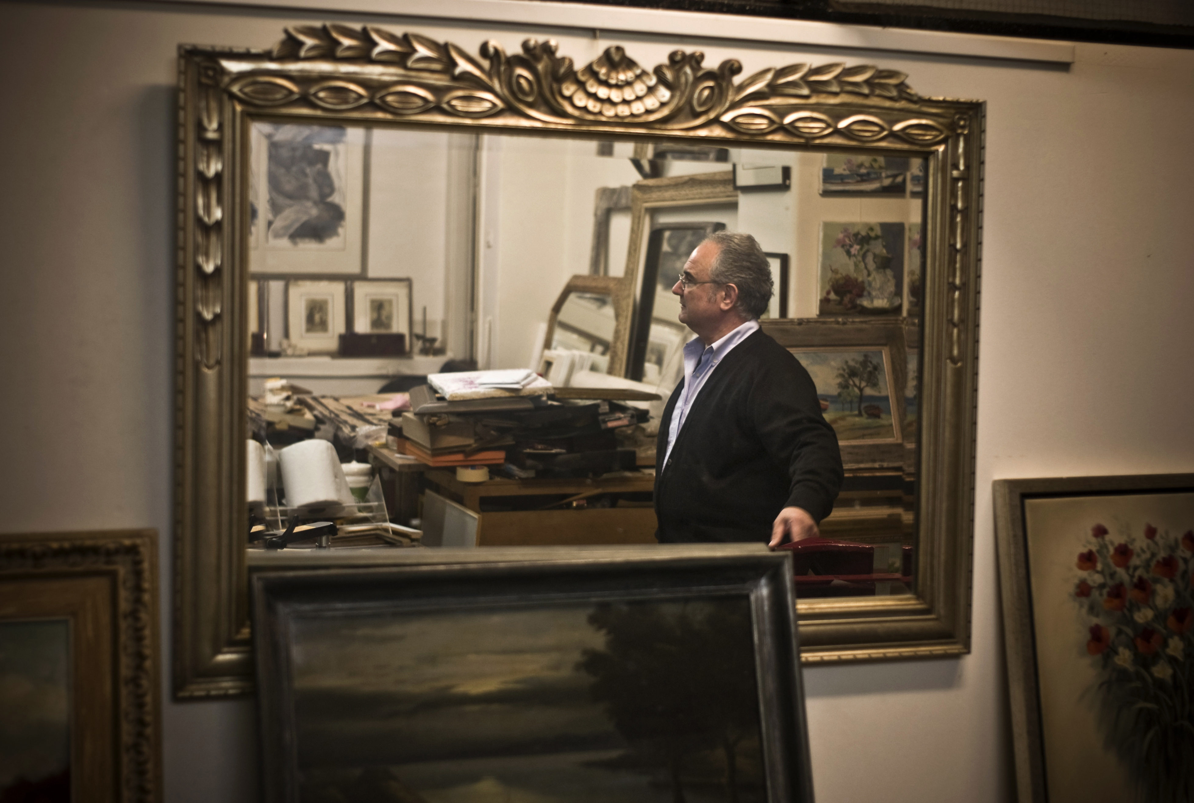 Κατεβαίνουμε κάτω στο εργαστήριο. Εδώ βρίσκεται η καρμανιόλα και το καρφωτικό μηχάνημα. «Δε χρησιμοποιώ καθόλου πιστόλι» αποκαλύπτει για τον τρόπο που δουλεύει, μιας και περάσαμε στα ενδότερα. «Τα φτιάχνω όλα στο χέρι με μπάλα, ακόμα και τα βερνίκια. Ελάχιστοι βέβαια το καταλαβαίνουν. Εντάξει, υπάρχουν κάποιοι που το εκτιμούν, αλλά είναι κάτι που φαίνεται κυρίως σε βάθος χρόνου. Θα σας πω όμως και το άλλο: Χειροποίητες αποκαλούμε συχνά και τις κορνίζες που φτιάχνονται με βέργα. Στις πραγματικά χειροποίητες όμως, φτιάχνεις το πατινάρισμα αφού κοπεί και καρφωθεί το ξύλο κι έτσι είναι πολύ πιο δύσκολο να ταιριάξουν οι λεπτομέρειες στις γωνίες». Μας δείχνει ένα ξύλο που εισήγαγε από τη Φλωρεντία, κάτι κεριά (διαφορετικής σκληρότητας το καθένα) που παρασκευάζει ο ίδιος για βοήθημα, μια κόλλα κόστους 80 ευρώ φυλαγμένη σε μπολάκι. «Πέρα απ’ τη δουλειά, όταν έχω χρόνο ή ψυχολογικά προβλήματα, κατεβαίνω εδώ και κάνω τα δικά μου» εξομολογείται βάζοντας τα γέλια.