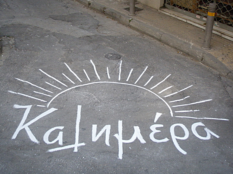 Κάποτε η λέξη «Καλημέρα» αναγράφονταν στους καθρέφτες πάνω από τον νιπτήρα. Μια υπενθύμιση για να πάρεις τη ζωή λίγο αλλιώς, να βρεις τη δύναμη να ανταπεξέλθεις στη βαρετή δουλειά, στις μικροαναποδιές, στο στριμωξίδι στο τρένο. Δεν είναι ακόμα πιο όμορφο να την δείς μια μέρα γραμένη στο δρόμο κάτω από το σπίτι σου;