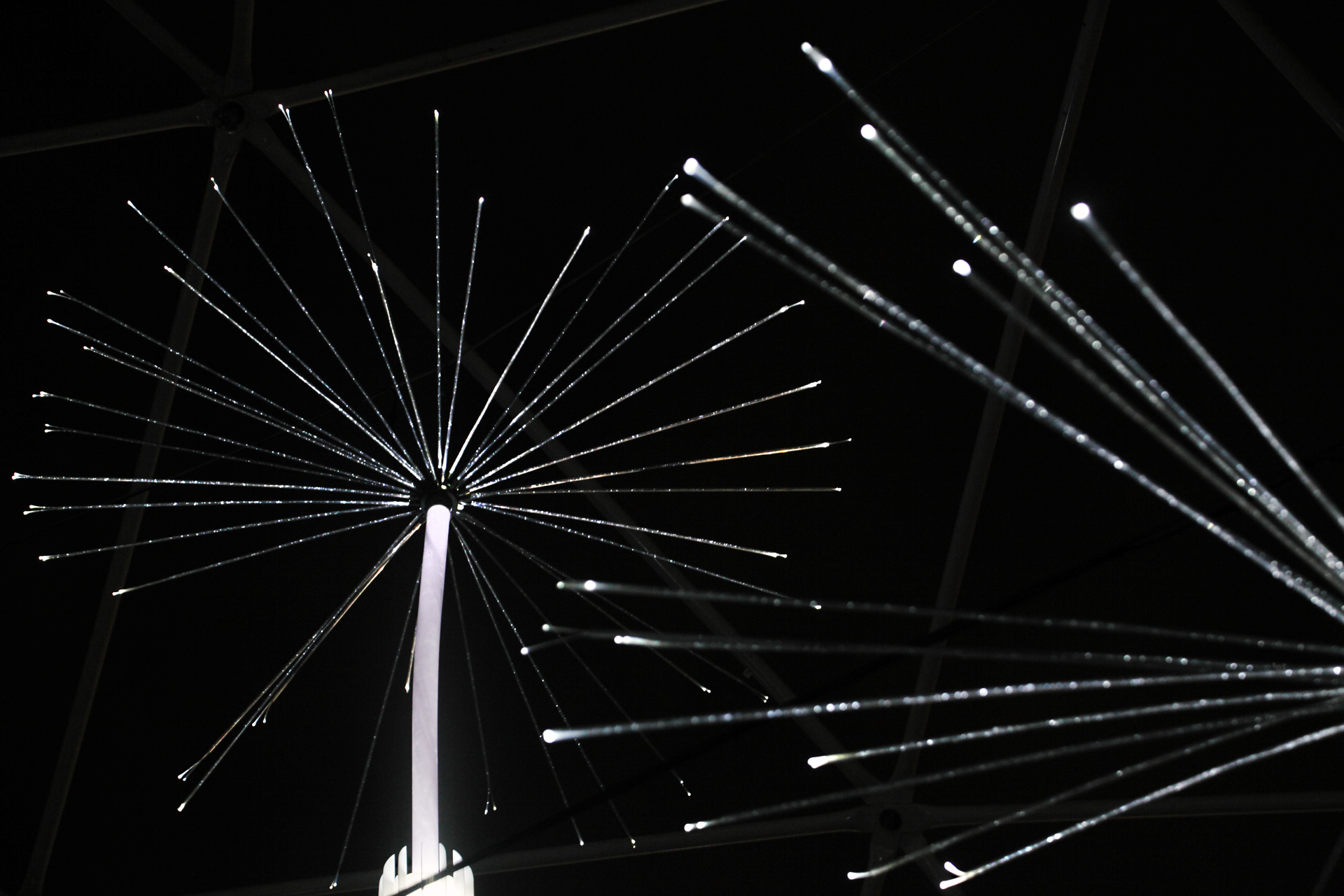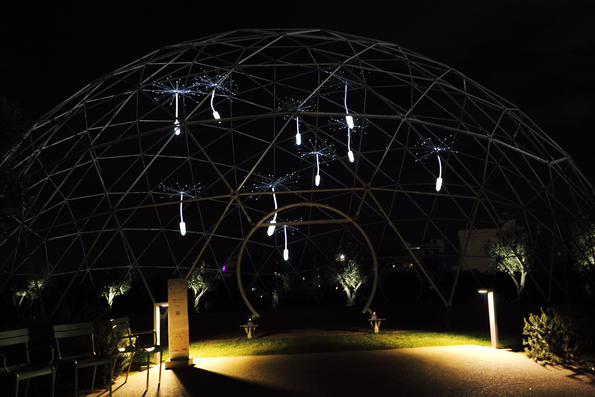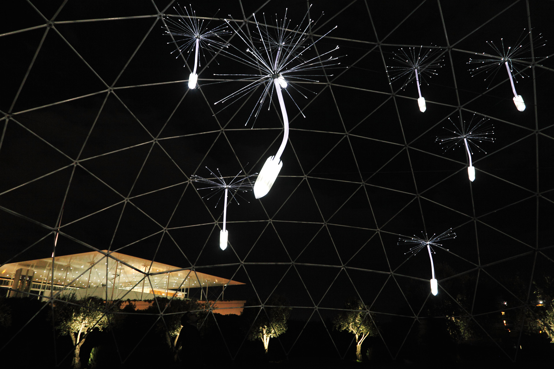 Στο έργο Light a Wish του OGE Group, δέκα φωτεινές πικραλίδες, ή “κλέφτες” όπως τους γνωρίζουμε οι περισσότεροι, ύψους δύο μέτρων η κάθε μία, αιωρούνται από πάνω μας, στη κορυφή του Θόλου, και μοιράζονται μαζί μας αυτή τη μαγική στιγμή όπου οι σπόροι διασκορπίζονται, μεταφέροντας τις ευχές μας στον κόσμο. Το κάθε τεχνητό φυτό μοιάζει αδιόρατα να επικοινωνεί με τα υπόλοιπα και όλα μαζί λάμπουν με έναν τρόπο που δίνει την εντύπωση πως αναπνέουν.