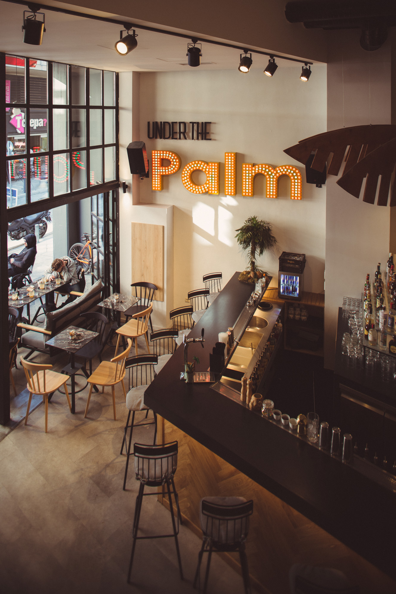 Εκτός από τα τραπέζια στον εξωτερικό του χώρο θα παρατηρήσετε ότι στο εσωτερικό υπάρχει άφθονος χώρος για να σταθείτε όρθιοι και να χορέψετε προφανώς. «Όλα απλά, όλα φτιαγμένα και σχεδιασμένα με ένα μόνο σκοπό: να περάσεις καλά», κατά την ομάδα του Under The Palm που η χαλαρότητα και η διάθεσή της να γίνει το Under The Palm το νέο στέκι διασκέδασης στο κέντρο φαίνεται και από τα hastags που έχει επιλέξει στα social media, το #TheSeDoStoFoinika και #MeTaPaidia.