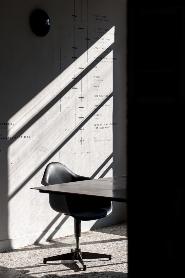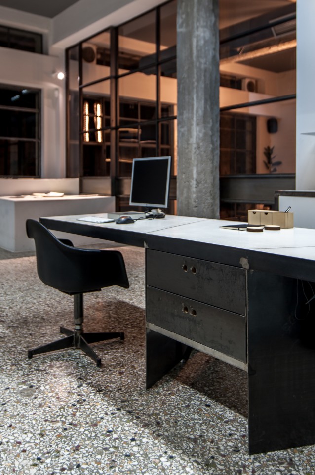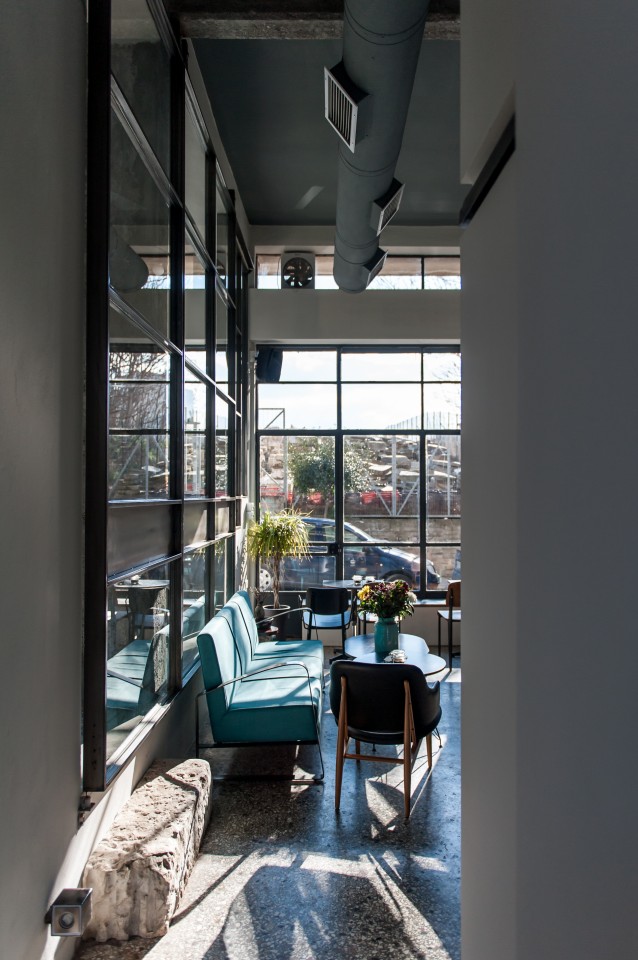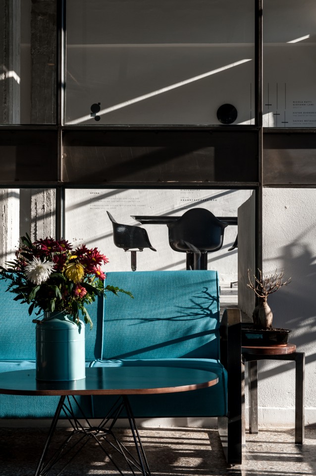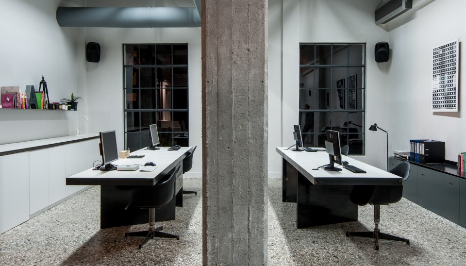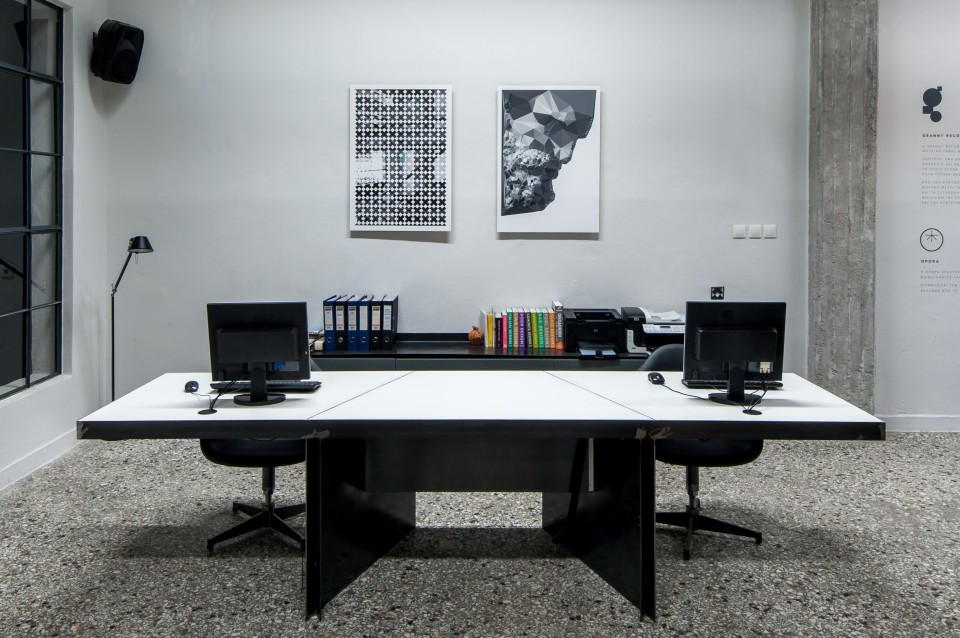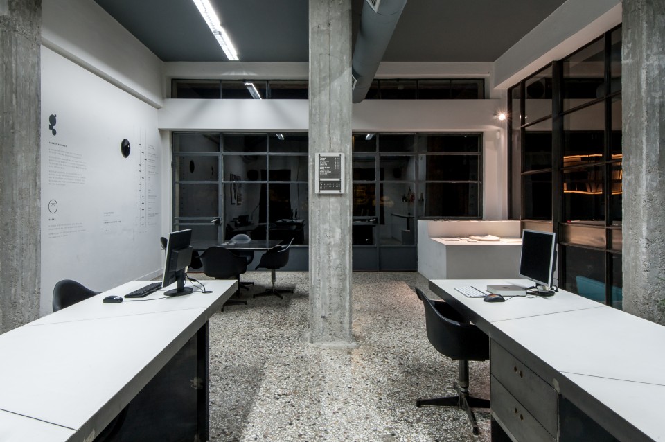 Προχωρήσαμε βασιζόμενοι στην αρχιτεκτονική της ευρύτερης περιοχής και χωρίσαμε τους χώρους ανάλογα με τις ανάγκες των δραστηριοτήτων. Κατανείμαμε τα σημεία των δράσεων στο χώρο με τον καλύτερο τρόπο για να αξιοποιήσουμε το κάθε τετραγωνικό στο μέγιστο βαθμό. Στην ουσία στεγάσαμε σε έναν κοινό χώρο ο καθένας τη δραστηριότητά του. Ξεχωριστά αλλά και μαζί, η αρχιτεκτονική, η γραφιστική, ο σχεδιασμός και το καφέ. Θέλαμε να υπάρχει ένας χώρος για να συζητάμε τις ιδέες μας όταν βρισκόμαστε το πρωί πίνοντας ένα καφέ και μετά στο διπλανό χώρο των γραφείων να τις οργανώνουμε ώστε να υλοποιηθούν. Ο χώρος του καφέ για μας αποτελεί μια κυψέλη και γίνεται ο πυρήνας των δράσεών μας. Πιστεύουμε ότι είναι ένας σύγχρονος τρόπος να συλλειτουργήσουν κάποιες επιχειρήσεις κάθε μία ξεχωριστά αλλά και όλες μαζί.
