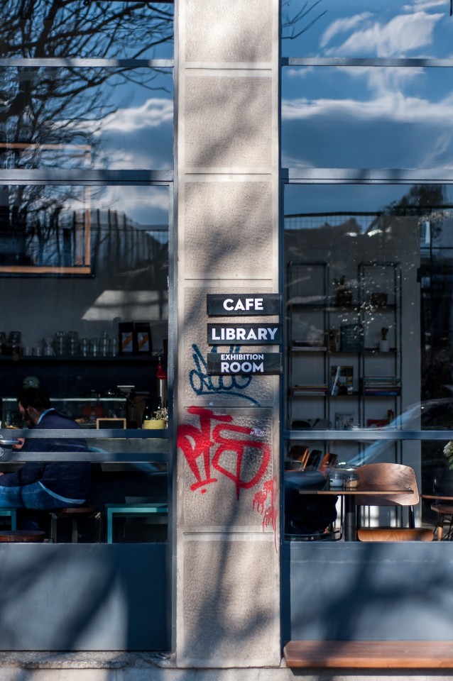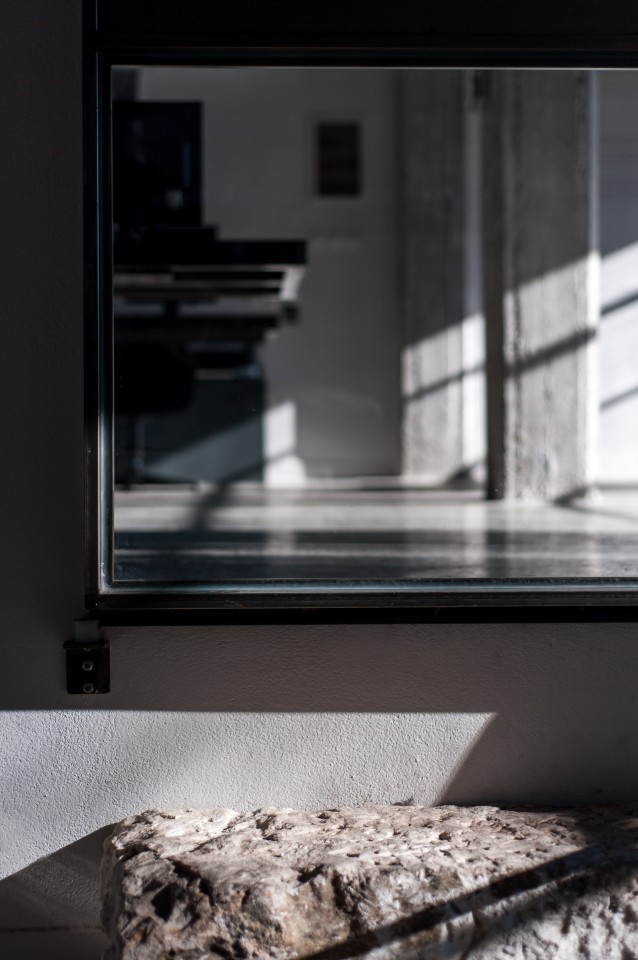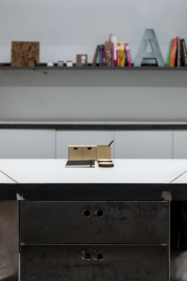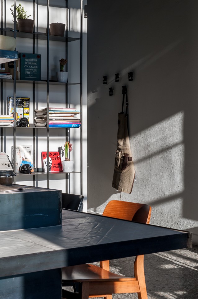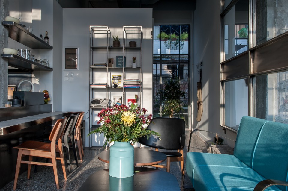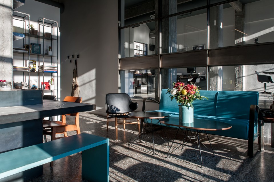 Προχωρήσαμε βασιζόμενοι στην αρχιτεκτονική της ευρύτερης περιοχής και χωρίσαμε τους χώρους ανάλογα με τις ανάγκες των δραστηριοτήτων. Κατανείμαμε τα σημεία των δράσεων στο χώρο με τον καλύτερο τρόπο για να αξιοποιήσουμε το κάθε τετραγωνικό στο μέγιστο βαθμό. Στην ουσία στεγάσαμε σε έναν κοινό χώρο ο καθένας τη δραστηριότητά του. Ξεχωριστά αλλά και μαζί, η αρχιτεκτονική, η γραφιστική, ο σχεδιασμός και το καφέ. Θέλαμε να υπάρχει ένας χώρος για να συζητάμε τις ιδέες μας όταν βρισκόμαστε το πρωί πίνοντας ένα καφέ και μετά στο διπλανό χώρο των γραφείων να τις οργανώνουμε ώστε να υλοποιηθούν. Ο χώρος του καφέ για μας αποτελεί μια κυψέλη και γίνεται ο πυρήνας των δράσεών μας. Πιστεύουμε ότι είναι ένας σύγχρονος τρόπος να συλλειτουργήσουν κάποιες επιχειρήσεις κάθε μία ξεχωριστά αλλά και όλες μαζί.