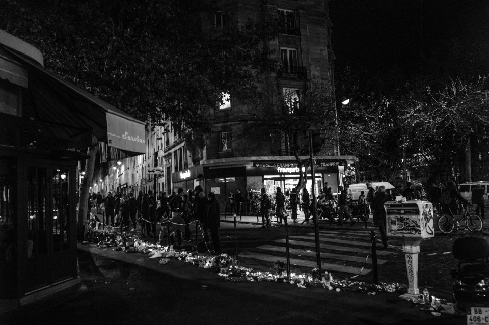 Γωνία των δρόμων Faidherbe και Charonne, οι άνθρωποι έρχονται και αφήνουν λίγα λουλούδια ή ένα κερί στο «La Belle Equipe». Παρίσι, Κυριακή 15 Νοεμβρίου 2015.