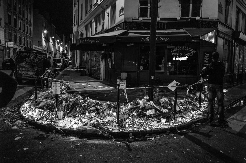 Έξω από το εστιατόριο Cosa Nostra, ένα από επτά σημεία που χτυπήθηκαν από τους τρομοκράτες. Οδός du fbg du temple , κοντά στην Place de la Republique. Παρίσι, Κυριακή 15 Νοεμβρίου 2015.