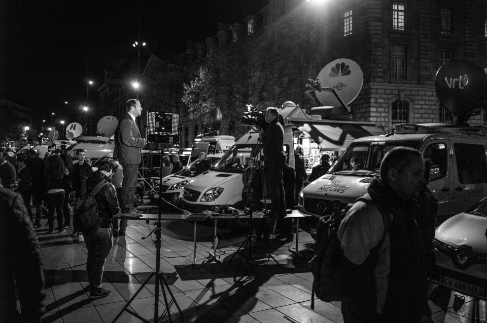 Στην Place de Republique, ζωντανές μεταδόσεις από δημοσιογράφους για το ραδιόφωνο και την τηλεόραση και τηλεοπτικά βανς παντού. Παρίσι, Κυριακή 15 Νοεμβρίου 2015.