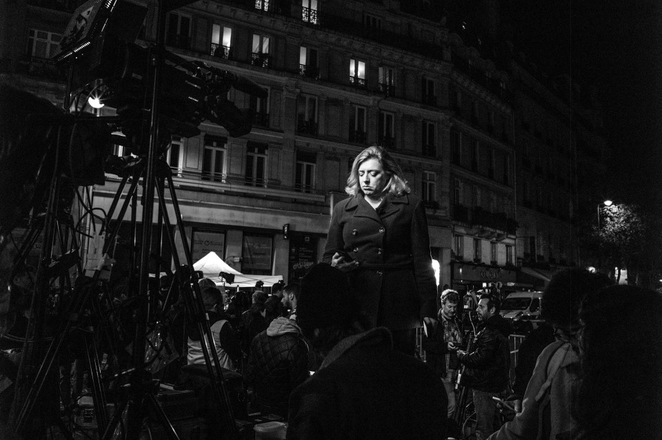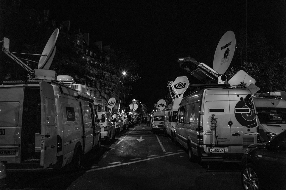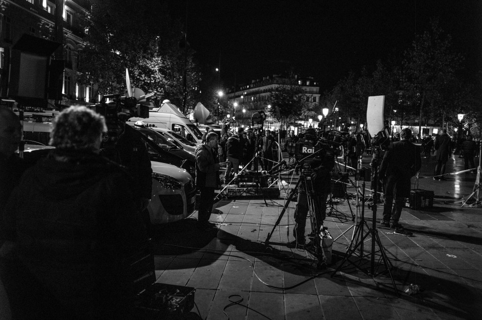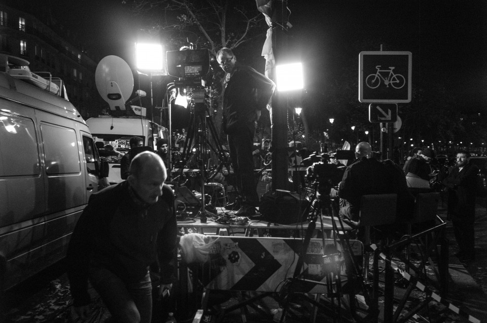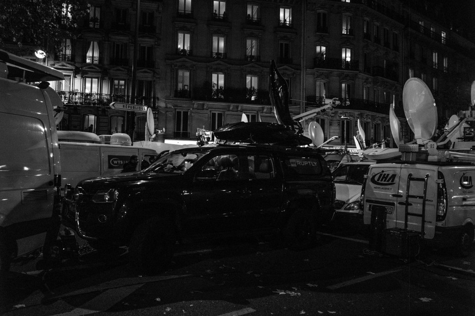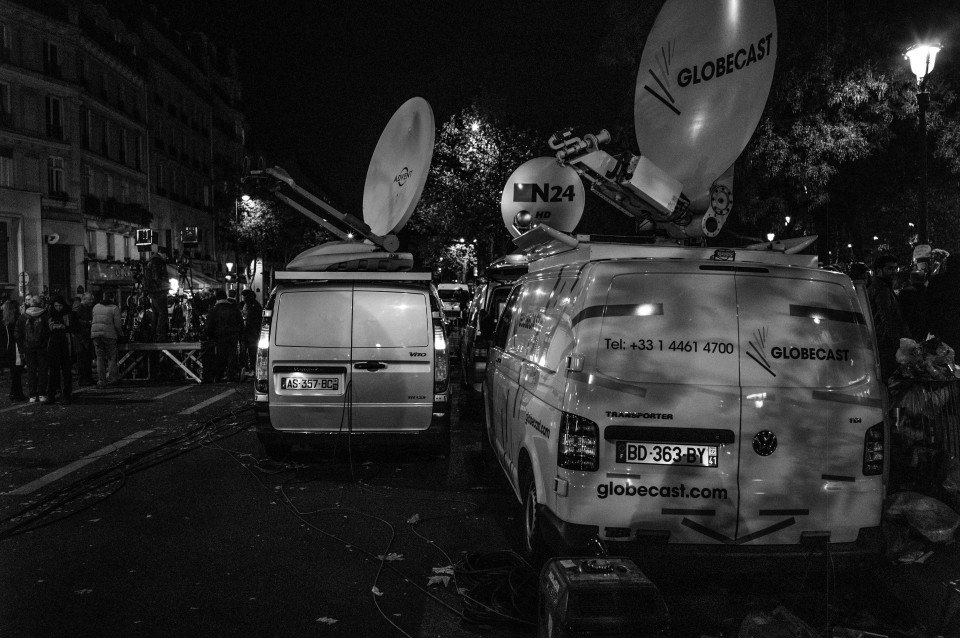 Πολύ κοντά στο Μπατακλάν, τα τηλεοπτικά βανς γίνονται όλο και περισσότερα. Παρίσι, Κυριακή 15 Νοεμβρίου 2015.