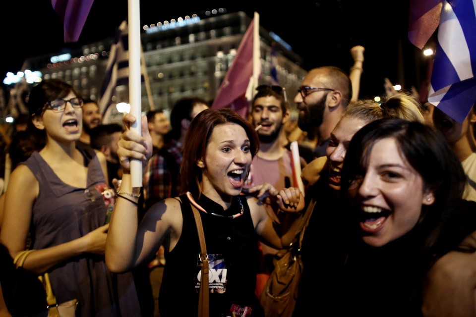 Πανηγυρισμοί υποστηρικτών του ΟΧΙ και της νεολαίας ΣΥΡΙΖΑ, μετά τα τελικά αποτέλεσματα του δημοψηφίσματος, στο Σύνταγμα. Αθήνα, Κυριακή 5 Ιουλίου 2015.