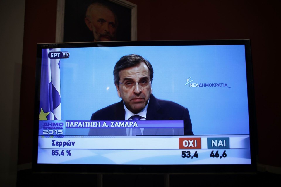 Δημοσιογράφοι και μίντια από όλο τον κόσμο παρουσιάζουν τα πρώτα αποτελέσματα του δημοψηφίσματος από την πλατεία Συντάγματος. Αθήνα, Κυριακή 5 Ιουλίου 2015.
