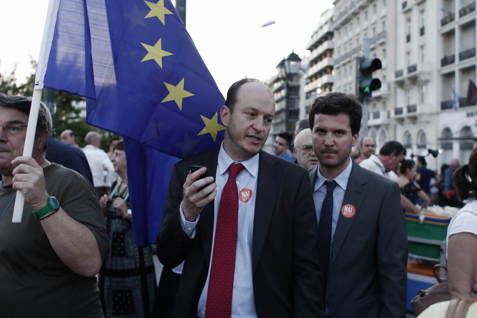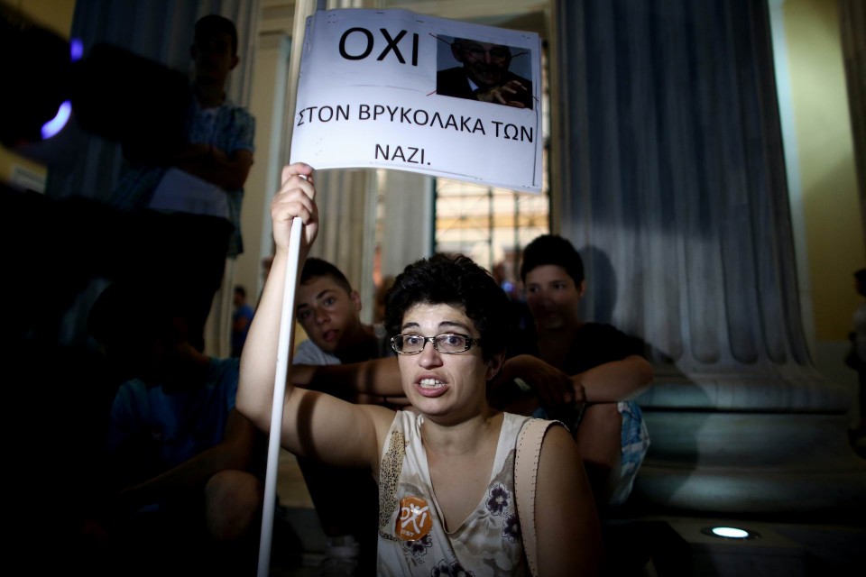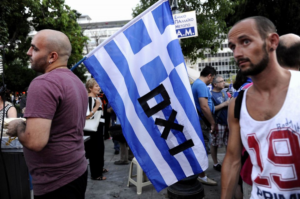 Νεαρός άντρας πανηγυρίζει τα πρώτα αποτελέσματα του δημοψηφίσματος με φανερή την επικράτηση του ΟΧΙ, στην πλατεία Συντάγματος. Αθήνα, Κυριακή 5 Ιουλίου 2015.