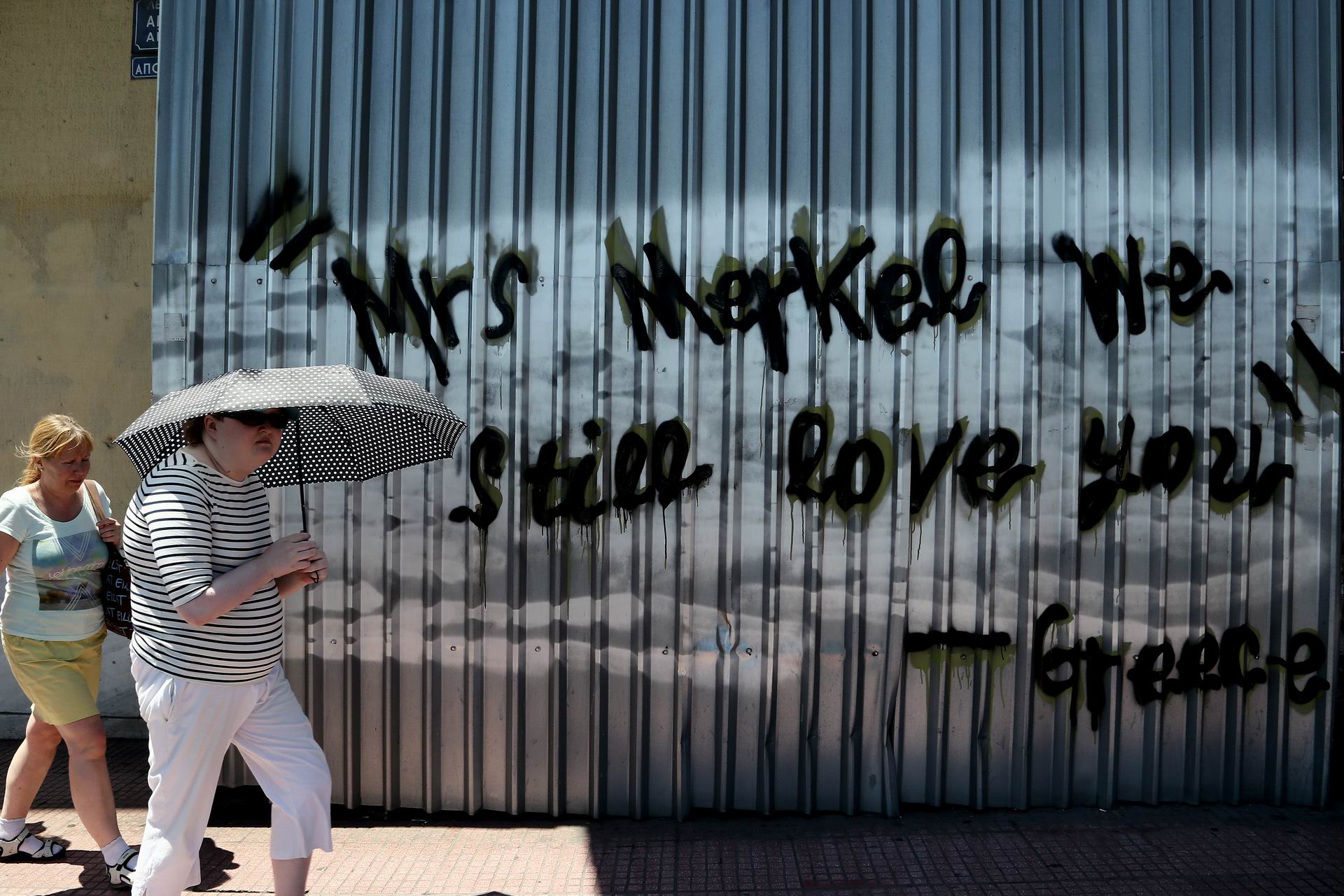 Μήνυμα προς την Άνγκελα Μέρκελ σε γκράφιτι στην Αθήνα. Κυριακή 5 Ιουλίου 2015, ημέρα διεξαγωγής του δημοψηφίσματος.