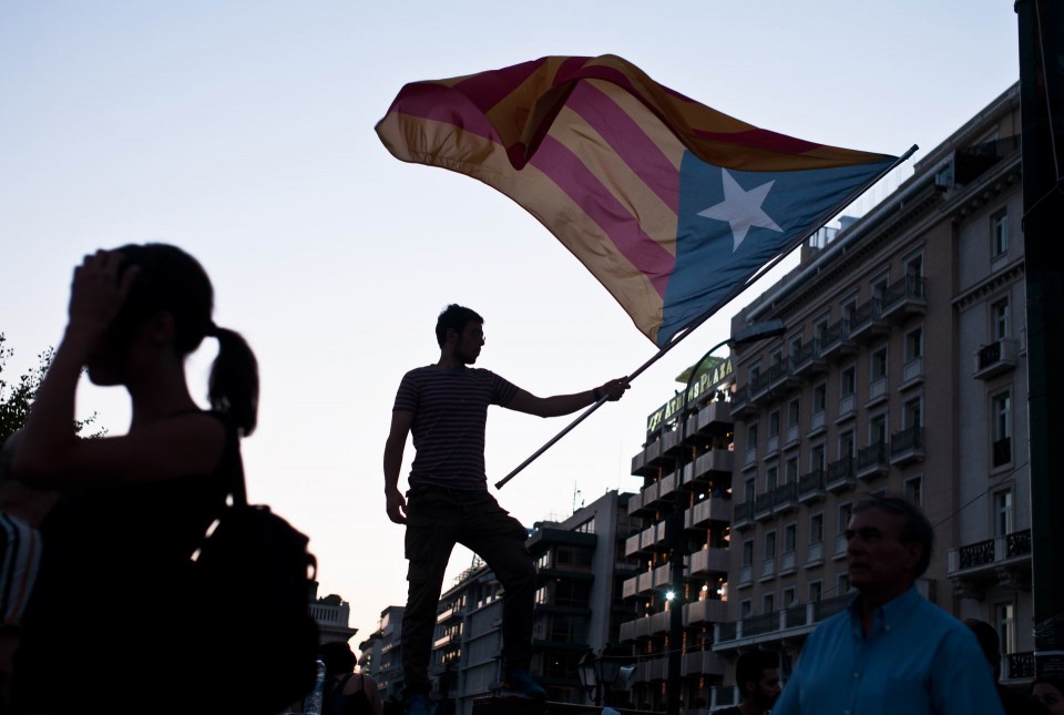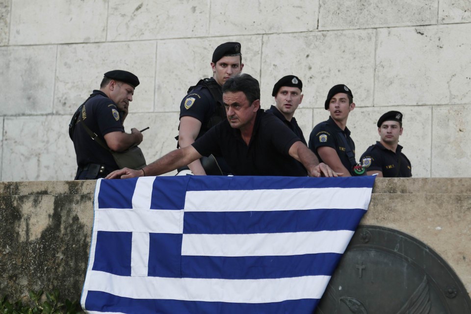 Άντρας απλώνει την ελληνική σημαία στα προπύλαια της Βουλής. Στιγμιότυπο κατά την διάρκεια συγκέντρωσης διαμαρτυρίας από ΑΔΕΔΥ και ΑΝΤΑΡΣΥΑ, κατά της επικείμενης δανειακής σύμβασης με τον Ευρωπαϊκό Μηχανισμό Σταθερότητας (ESM), στην πλατεία Συντάγματος. Αθήνα, Δευτέρα 13 Ιουλίου 2015.