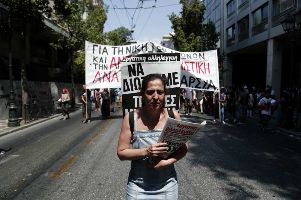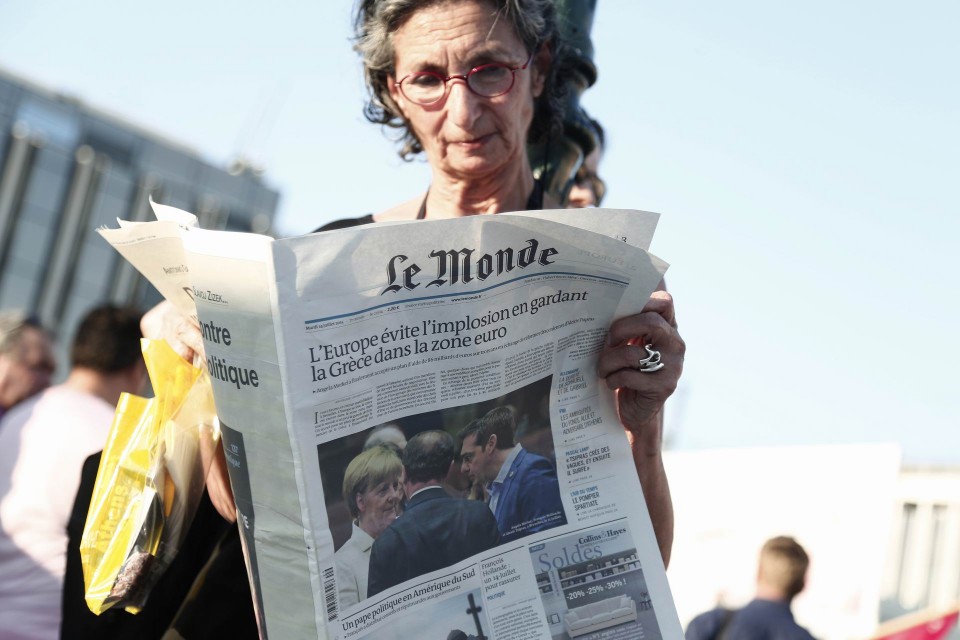 Γυναίκα διαβάζει την γαλλική Le Monde, με πρωτοσέλιδο την συνάντηση κορυφής της Ευρωζώνης, με θέμα την κρίση στην Ελλάδα. Στιγμιότυπο κατά την διάρκεια συγκέντρωσης διαμαρτυρίας από ΑΔΕΔΥ και ΑΝΤΑΡΣΥΑ, κατά της επικείμενης δανειακής σύμβασης με τον Ευρωπαϊκό Μηχανισμό Σταθερότητας (ESM), στην πλατεία Συντάγματος. Αθήνα, Δευτέρα 13 Ιουλίου 2015.