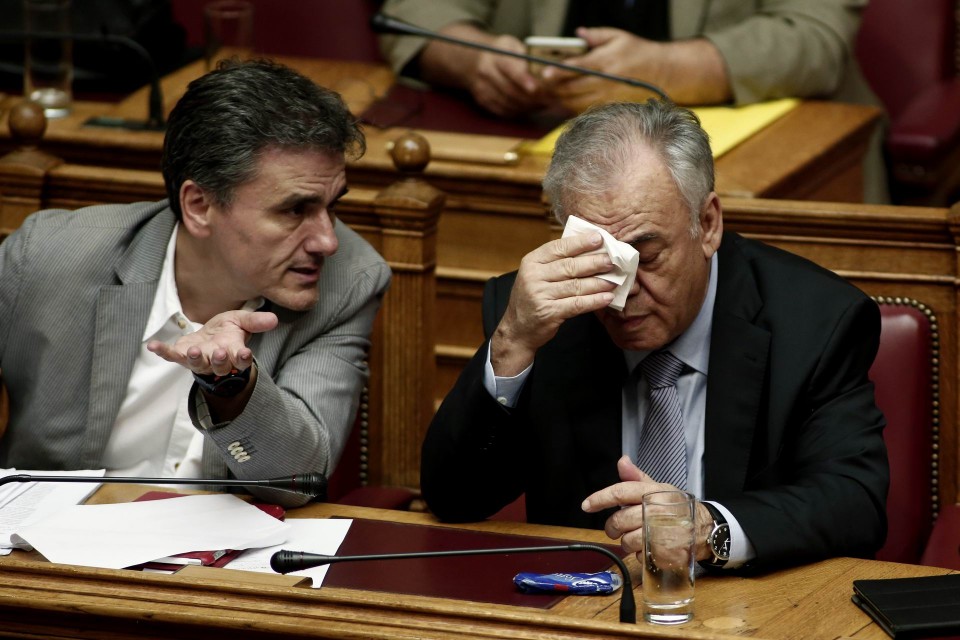 Οι υπουργοί Ευκλείδης Τσακαλώτος και Γιάννης Δραγασάκης. Συζήτηση και ψήφιση στην Ολομέλεια του Ελληνικού Κοινοβουλίου του σχεδίου νόμου, για την εξουσιοδότηση της Ελληνικής διαπραγματευτικής ομάδας για τη σύναψη της δανειακής σύμβασης με τον Ευρωπαϊκό Μηχανισμό Σταθερότητας (ESM). Αθήνα, Σάββατο 11 Ιουλίου 2015.