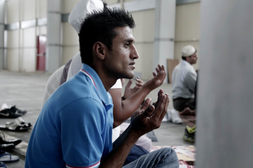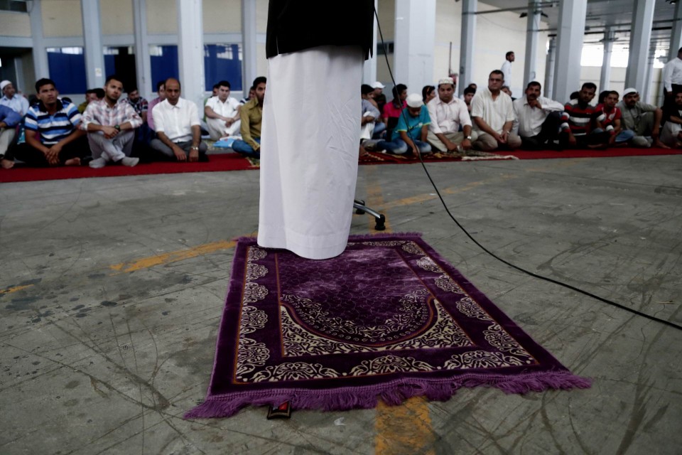 Μουσουλμάνος προσεύχεται την τελευταία μέρα του Ραμαζανιού, ημέρα της Λύσης της Νηστείας. Η ομαδική προσευχή, από τους Μουσουλμάνους που ζούνε στην Αθήνα, έλαβε χώρα σε κλειστό χώρο του ΣΕΦ. Παρασκευή 17 Ιουλίου 2015.