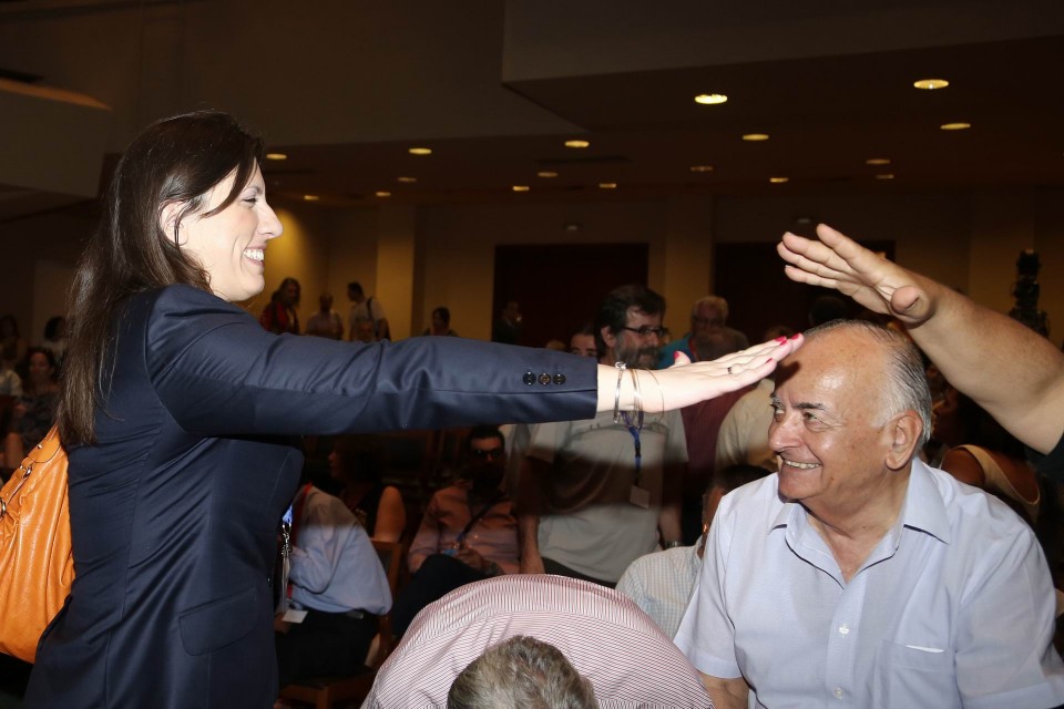 Η πρόεδρος της Βουλής Ζωή Κωνσταντοπούλου σε χαιρετισμό με φιλικό της πρόσωπο. Συνεδρίαση της Κεντρικής Επιτροπής του ΣΥΡΙΖΑ στο Σινέ Κεραμεικός. Αθήνα, Πέμπτη 30 Ιουλίου 2015.