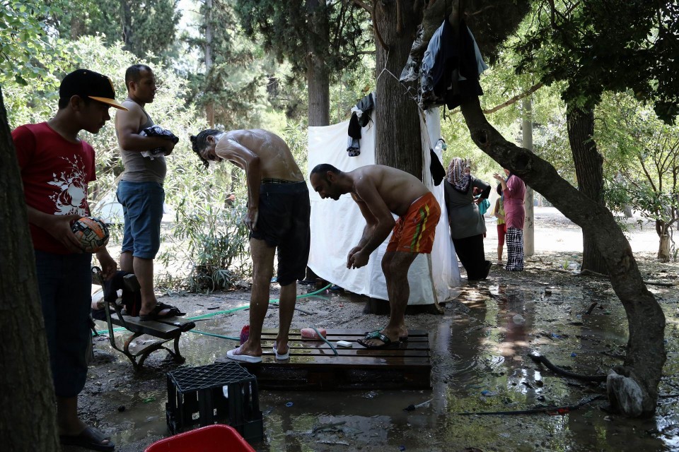 Άντρες προσπαθούν να πλυθούν σε δημόσια θέα. Όλο και περισσότεροι πρόσφυγες από το Αφγανιστάν μαζεύονται σε αυτοσχέδιο καταυλισμό που έχει στηθεί στο Πεδίο του Αρεως, σε δύσκολες συνθήκες διαβίωσης. Αθήνα, Παρασκευή 31 Ιουλίου 2015.